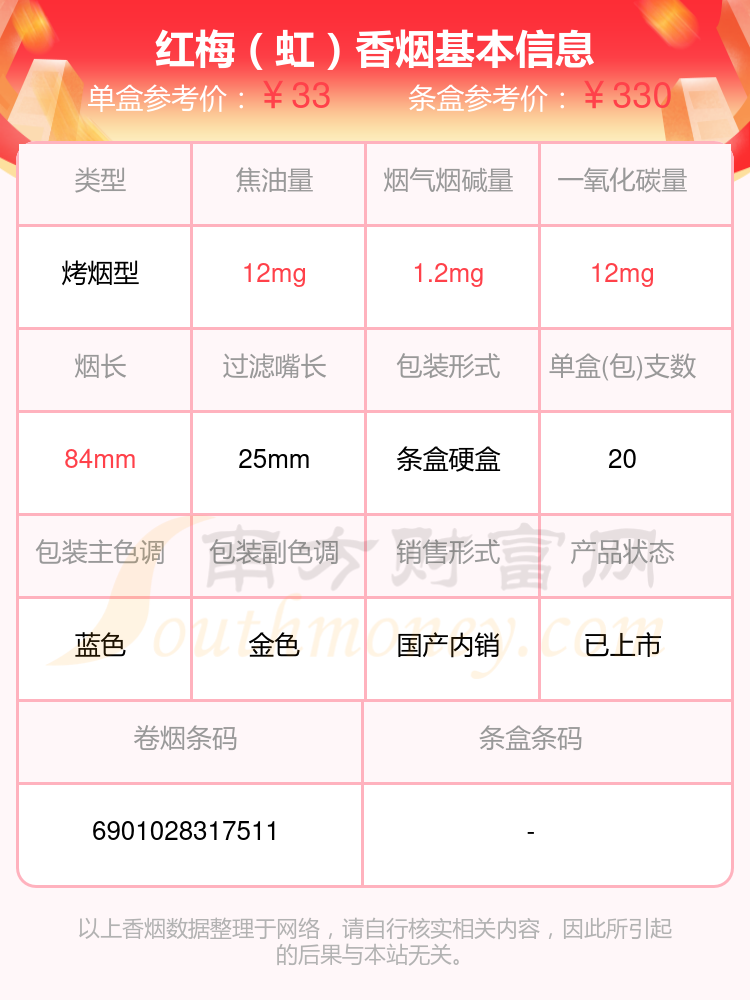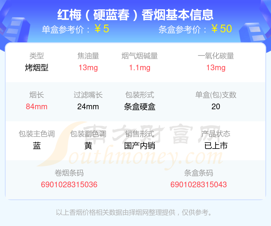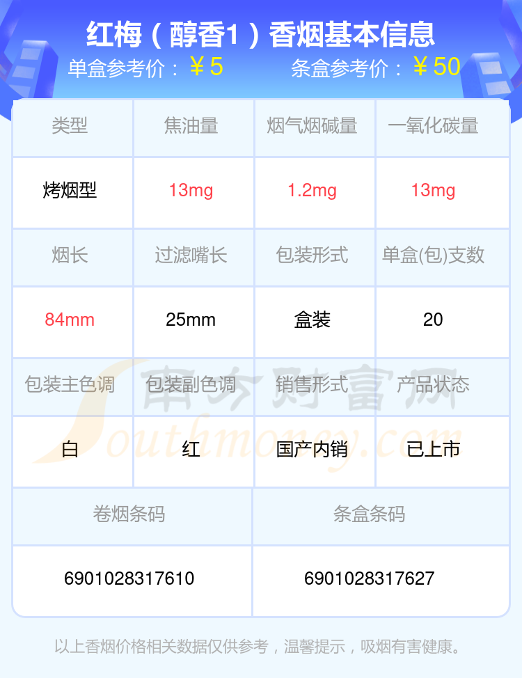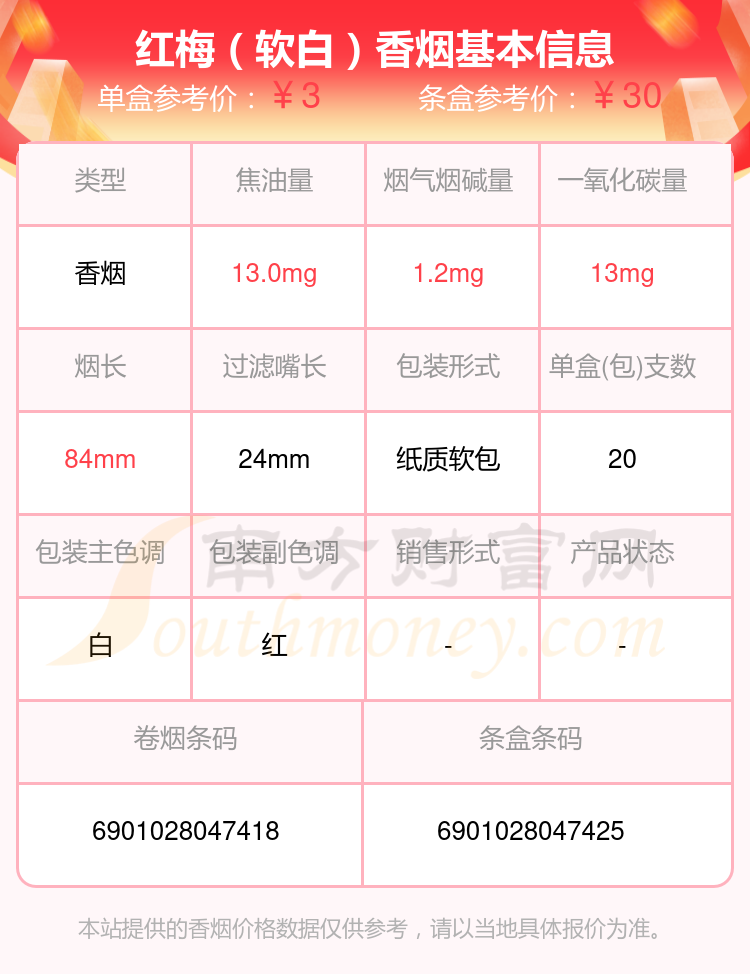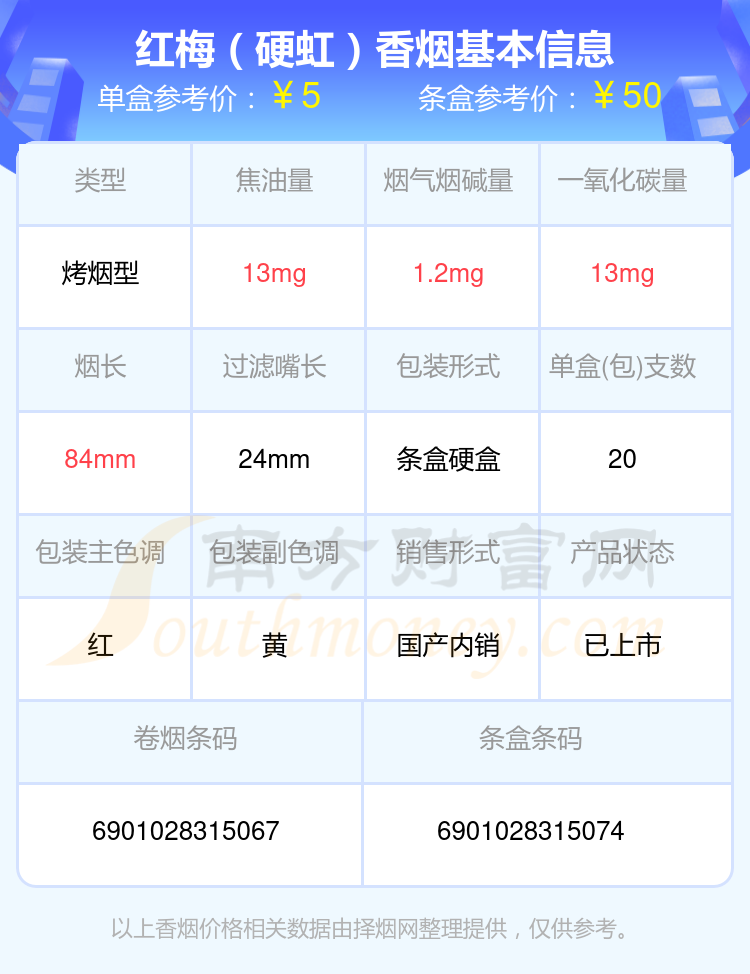 紅梅(醇香2)參考價(jià)5元/包、紅梅(虹)參考價(jià)33元/包、紅梅醇香2參考價(jià)5元/包、紅梅(醇香1)參考價(jià)5元/包、紅梅(軟白)參考價(jià)3.0元/包、紅梅(硬虹)參考價(jià)5元/包、紅梅(硬藍(lán)春)參考價(jià)5元/包、紅梅(硬春)參考價(jià)5元/包、紅梅(硬黃)參考價(jià)4.5元/包、紅梅(軟順)參考價(jià)2.5元/包等。