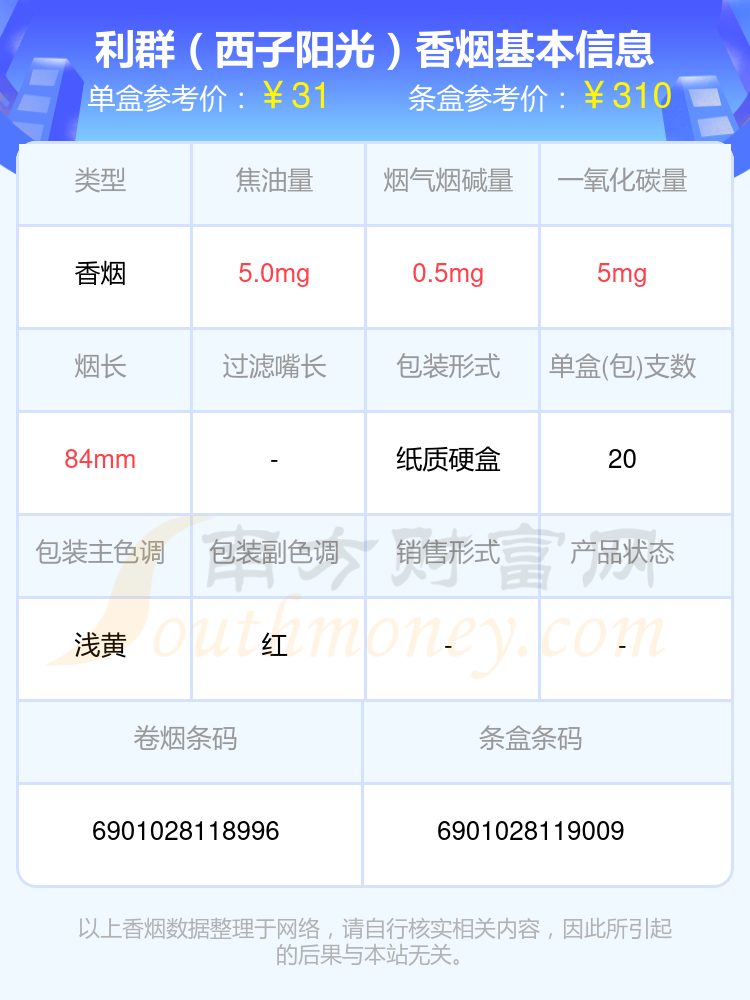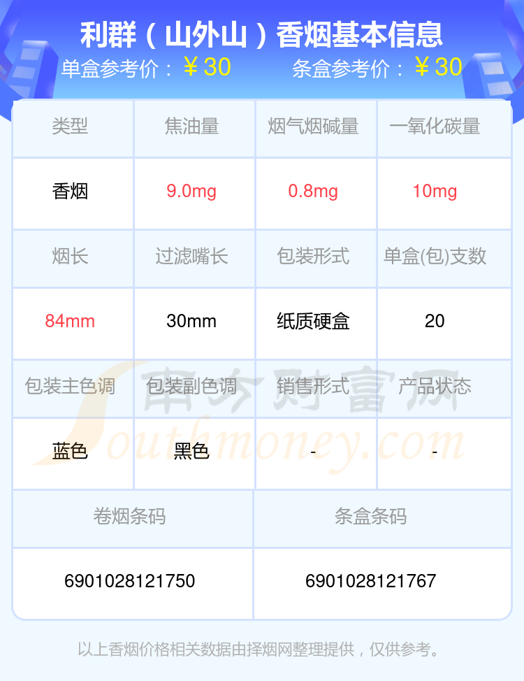 利群(陽光尊中支)參考價40元/包、利群(硬陽光)出口版參考價39.0元/包、利群(軟長嘴)參考價36.0元/包、利群(神州)新版參考價31.0元/包、利群(西子陽光)參考價31.0元/包、利群(山外山)參考價30.0元/包、利群(江南憶)參考價30.0元/包、利群(神州)參考價30.0元/包等。