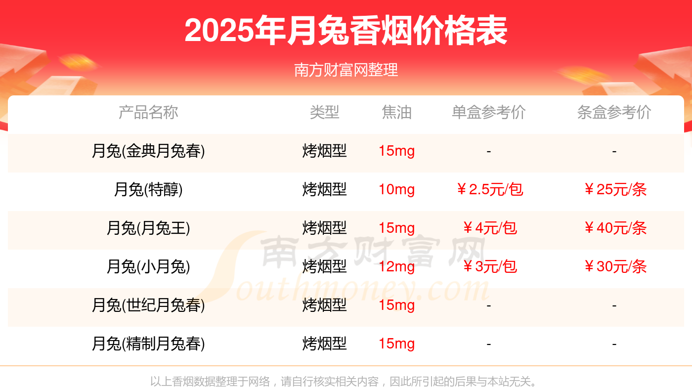 2025年月兔香煙月兔(月兔王)、月兔(小月兔)、月兔(特醇)等最新價(jià)格如下:月兔(月兔王)參考價(jià)4.0元/包、月兔(小月兔)參考價(jià)3.0元/包、月兔(特醇)參考價(jià)2.5元/包。