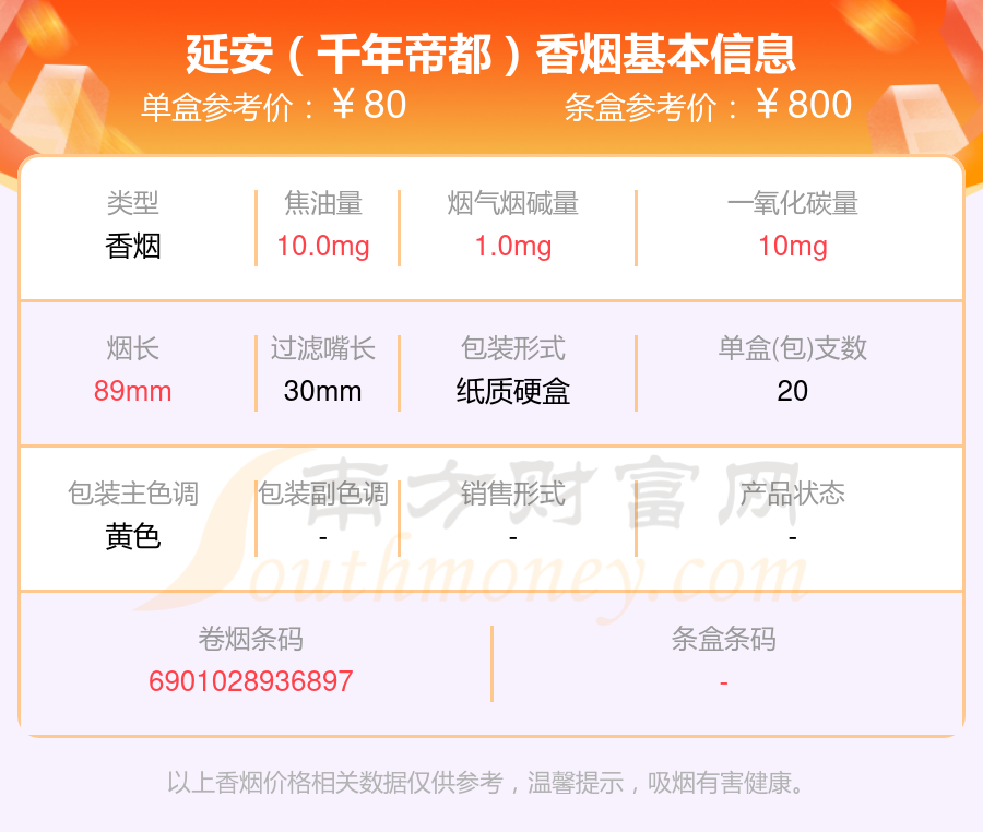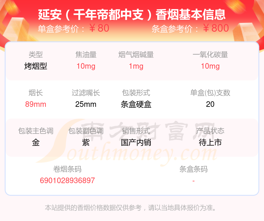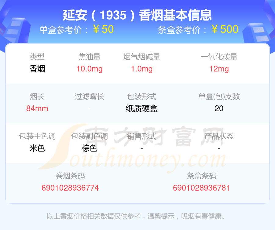 延安(千年帝都)參考價(jià)80.0元/包、延安(千年帝都中支)參考價(jià)80元/包、延安(細(xì)支1935)參考價(jià)60元/包、延安(1935)參考價(jià)50.0元/包、延安(中支1935)參考價(jià)50元/包、延安(1935中支)參考價(jià)50元/包等。