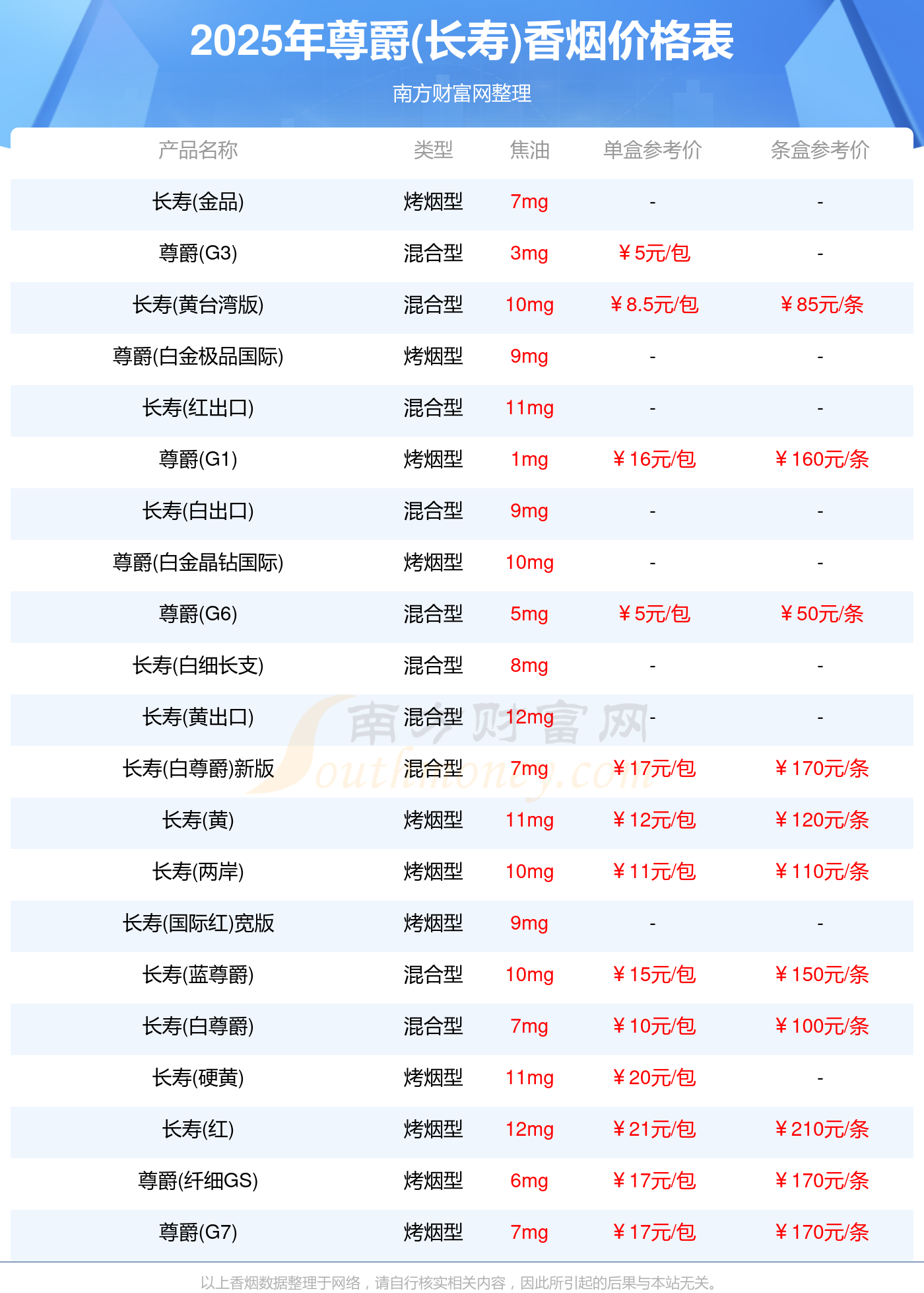 2025年尊爵(長(zhǎng)壽)香煙長(zhǎng)壽(紅)、長(zhǎng)壽(硬黃)、尊爵(纖細(xì)GS)、尊爵(G7)、長(zhǎng)壽(白尊爵)新版、尊爵(G1)、長(zhǎng)壽(藍(lán)尊爵)等最新價(jià)格如下:長(zhǎng)壽(紅)參考價(jià)21.0元/包、長(zhǎng)壽(硬黃)參考價(jià)20.0元/包、尊爵(纖細(xì)GS)參考價(jià)17.0元/包、尊爵(G7)參考價(jià)17.0元/包、長(zhǎng)壽(白尊爵)新版參考價(jià)17.0元/包、尊爵(G1)參考價(jià)16.0元/包、長(zhǎng)壽(藍(lán)尊爵)參考價(jià)15.0元/包。