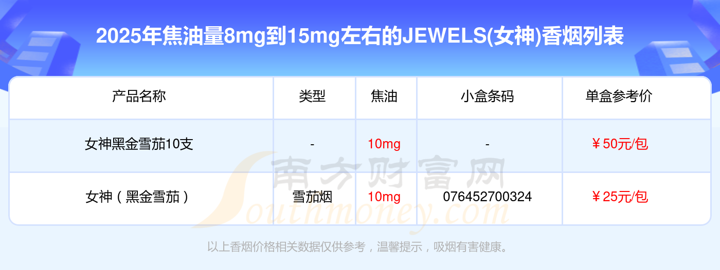 擇煙網(wǎng)為大家盤點(diǎn)了JEWELS(女神)香煙焦油量8mg到15mg左右的,分別有女神黑金雪茄10支、女神(黑金雪茄)等,具體價格如下: