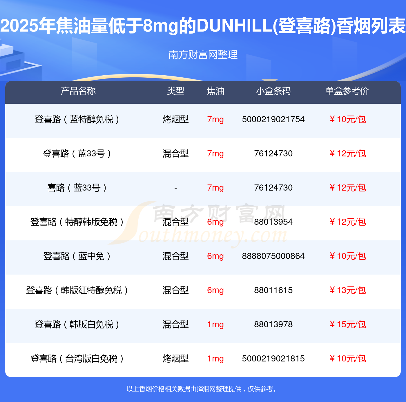 DUNHILL(登喜路)香煙焦油量低于8mg的煙有登喜路(藍(lán)特醇免稅)、登喜路(藍(lán)33號)、喜路(藍(lán)33號)、登喜路(特醇韓版免稅)、登喜路(藍(lán)中免)、登喜路(韓版紅特醇免稅)、登喜路(韓版白免稅)、登喜路(臺灣版白免稅)等,詳細(xì)價格如下: