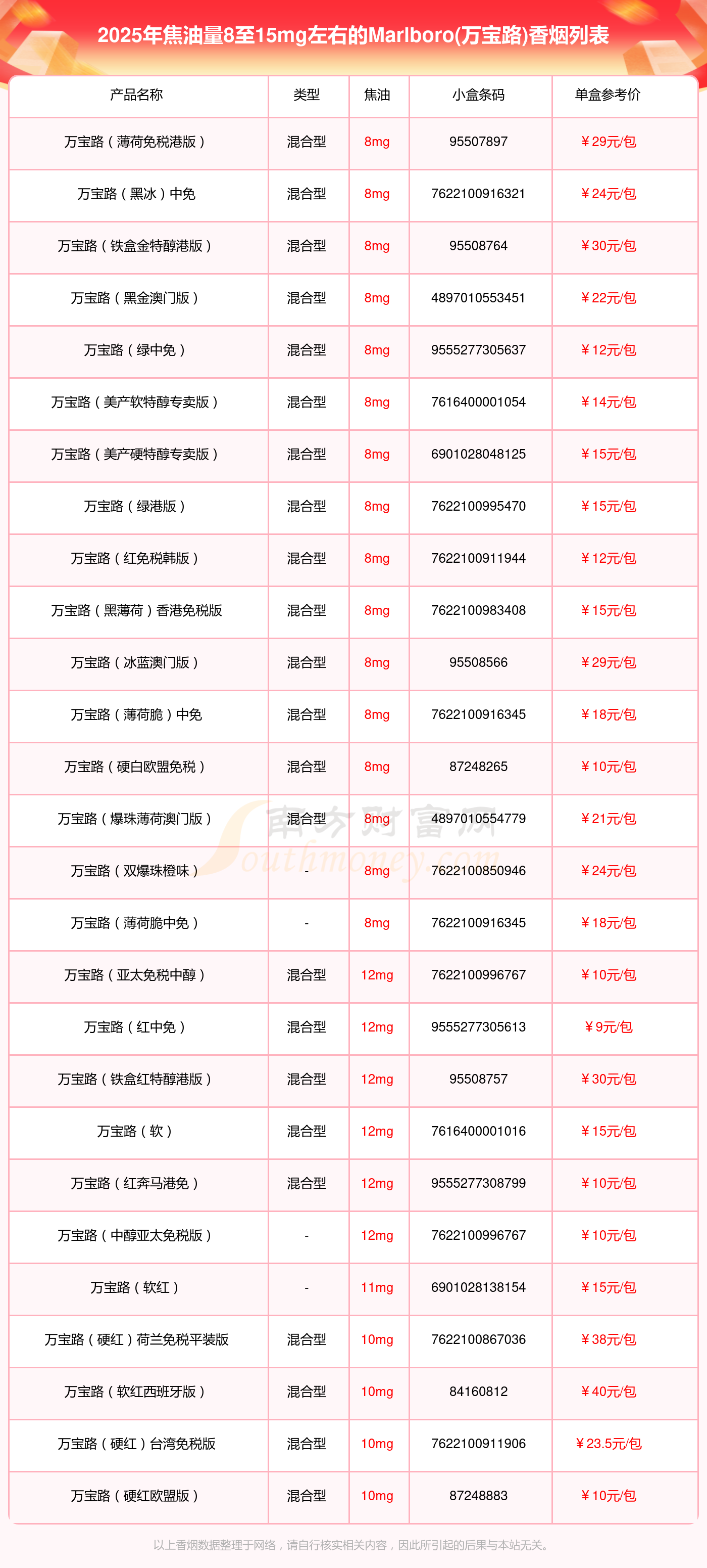 萬(wàn)寶路(薄荷免稅港版)參考價(jià)29.0元/包、萬(wàn)寶路(黑冰)中免參考價(jià)24.0元/包、萬(wàn)寶路(鐵盒金特醇港版)參考價(jià)30.0元/包、萬(wàn)寶路(黑金澳門(mén)版)參考價(jià)22.0元/包、萬(wàn)寶路(綠中免)參考價(jià)12.0元/包、萬(wàn)寶路(美產(chǎn)軟特醇專(zhuān)賣(mài)版)參考價(jià)14.0元/包、萬(wàn)寶路(美產(chǎn)硬特醇專(zhuān)賣(mài)版)參考價(jià)15.0元/包、萬(wàn)寶路(綠港版)參考價(jià)15.0元/包、萬(wàn)寶路(紅免稅韓版)參考價(jià)12.0元/包、萬(wàn)寶路(黑薄荷)香港免稅版參考價(jià)15.0元/包等。