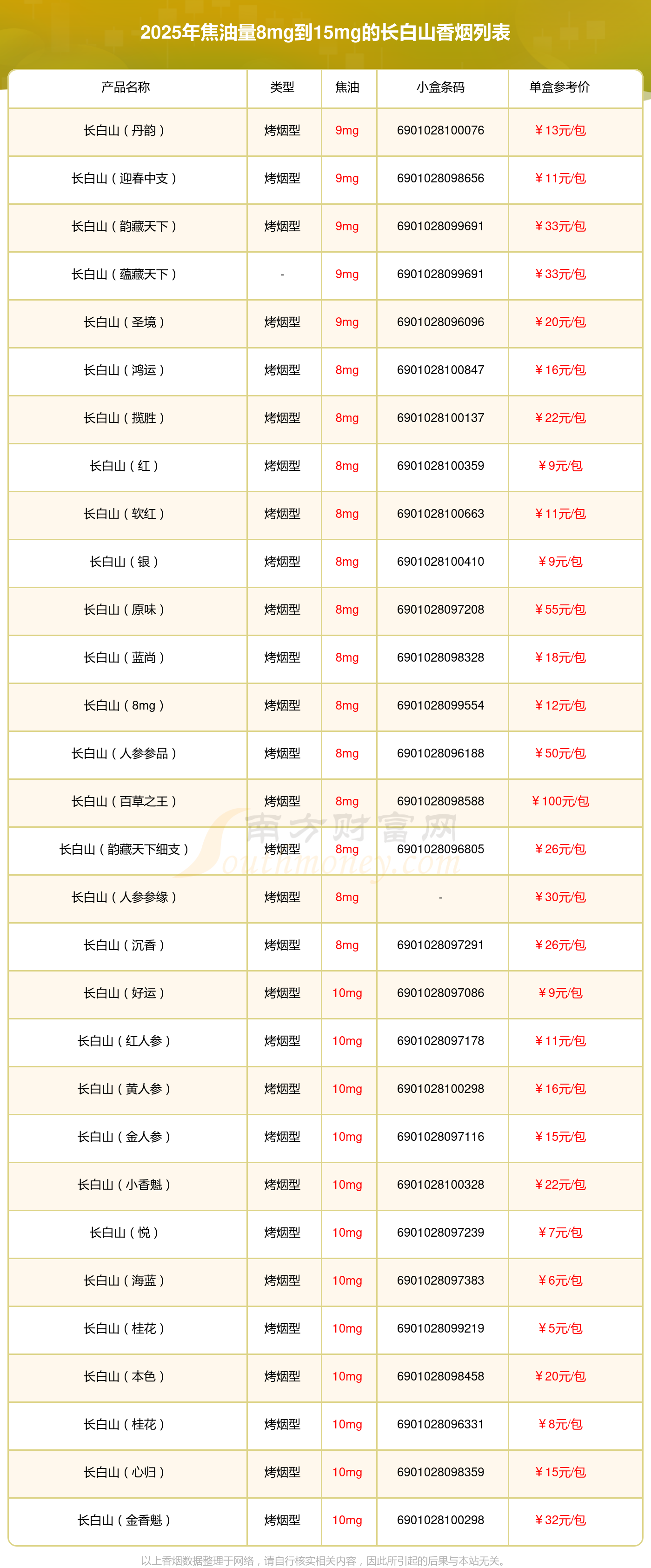 長(zhǎng)白山(丹韻)參考價(jià)13.0元/包、長(zhǎng)白山(迎春中支)參考價(jià)11.0元/包、長(zhǎng)白山(韻藏天下)參考價(jià)33元/包、長(zhǎng)白山(蘊(yùn)藏天下)參考價(jià)33元/包、長(zhǎng)白山(圣境)參考價(jià)20元/包、長(zhǎng)白山(鴻運(yùn))參考價(jià)16.0元/包、長(zhǎng)白山(攬勝)參考價(jià)22.0元/包、長(zhǎng)白山(紅)參考價(jià)9.0元/包、長(zhǎng)白山(軟紅)參考價(jià)11.0元/包、長(zhǎng)白山(銀)參考價(jià)9.0元/包等。