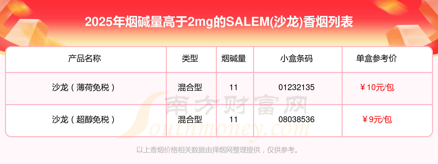 擇煙網(wǎng)為大家盤點(diǎn)了SALEM(沙龍)香煙煙堿量高于2mg的,分別有沙龍(薄荷免稅)、沙龍(超醇免稅)等,具體價格如下: