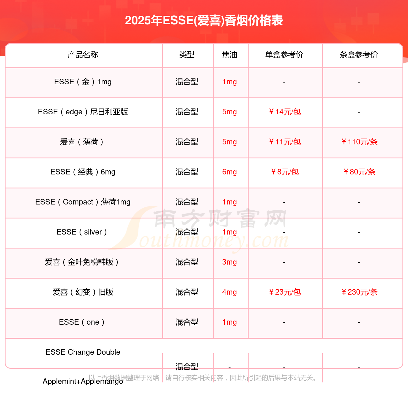 ESSE愛(ài)喜是韓國(guó)煙草公司旗下的品牌之一,目前中國(guó)大陸市場(chǎng)主要規(guī)格有ESSE薄荷(綠愛(ài)喜)、ESSE經(jīng)典(紅愛(ài)喜)、Esse特醇(藍(lán)愛(ài)喜)、Esse銀松(黑愛(ài)喜)等,是低刺激柔和的香煙。