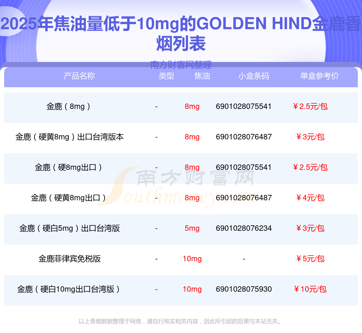 GOLDEN HIND金鹿香煙焦油量低于10mg的煙分別有金鹿(8mg)參考價(jià)2.5元/包、金鹿(硬黃8mg)出口臺(tái)灣版本參考價(jià)3元/包、金鹿(硬8mg出口)參考價(jià)2.5元/包、金鹿(硬黃8mg出口)參考價(jià)4元/包、金鹿(硬白5mg)出口臺(tái)灣版參考價(jià)3元/包、金鹿菲律賓免稅版參考價(jià)5元/包、金鹿(硬白10mg出口臺(tái)灣版)參考價(jià)10元/包等。