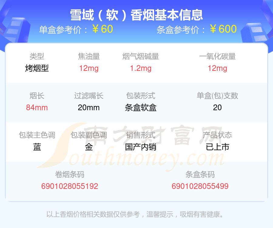 擇煙網(wǎng)為大家盤點(diǎn)了雪域香煙尼古丁量3mg以下的,分別有雪域(軟)、雪域(硬)等,詳細(xì)價(jià)格如下: