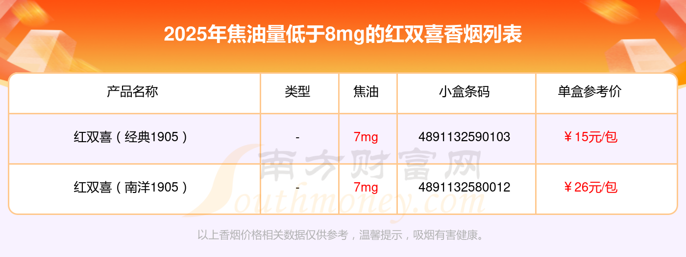 焦油量低于8mg的紅雙喜香煙有哪些?擇煙網(wǎng)為大家整理盤點(diǎn),有紅雙喜(經(jīng)典1905)、紅雙喜(南洋1905)等,詳細(xì)價格如下: