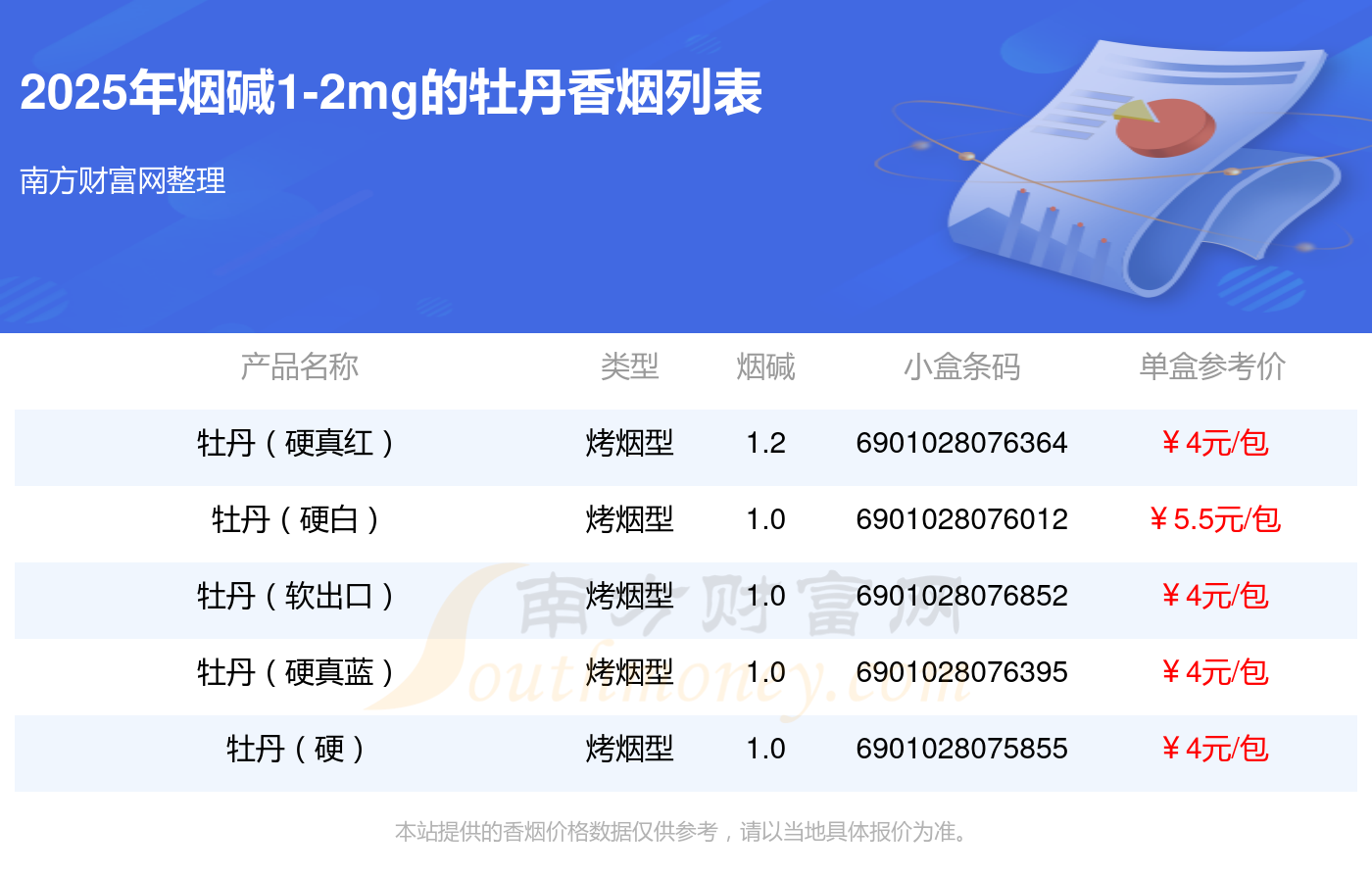 牡丹香煙煙堿1-2mg的煙有牡丹(硬真紅)、牡丹(硬白)、牡丹(軟出口)、牡丹(硬真藍(lán))、牡丹(硬)等,具體價格如下:
