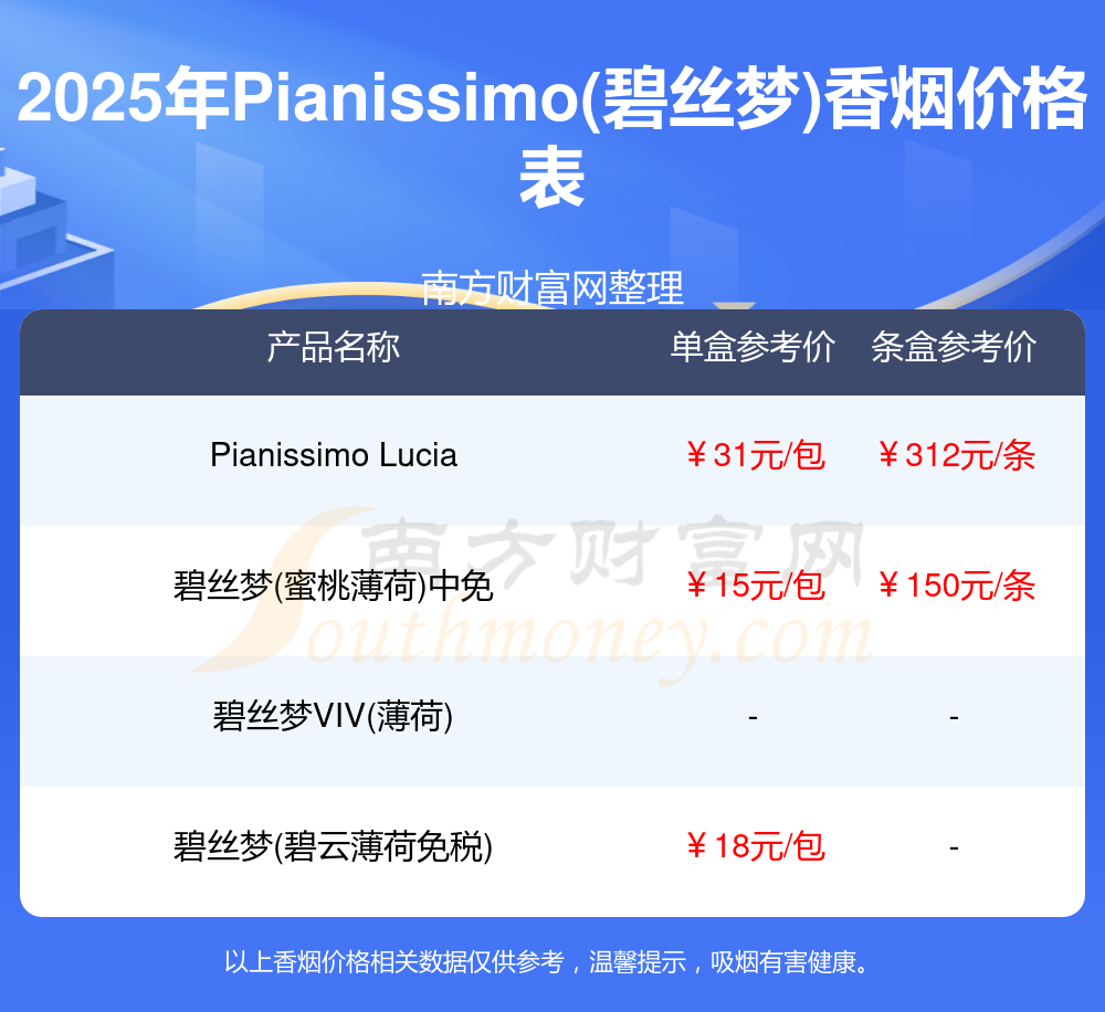 2025年P(guān)ianissimo(碧絲夢(mèng))香煙Pianissimo Lucia、碧絲夢(mèng)(碧云薄荷免稅)、碧絲夢(mèng)(蜜桃薄荷)中免等最新價(jià)格如下: