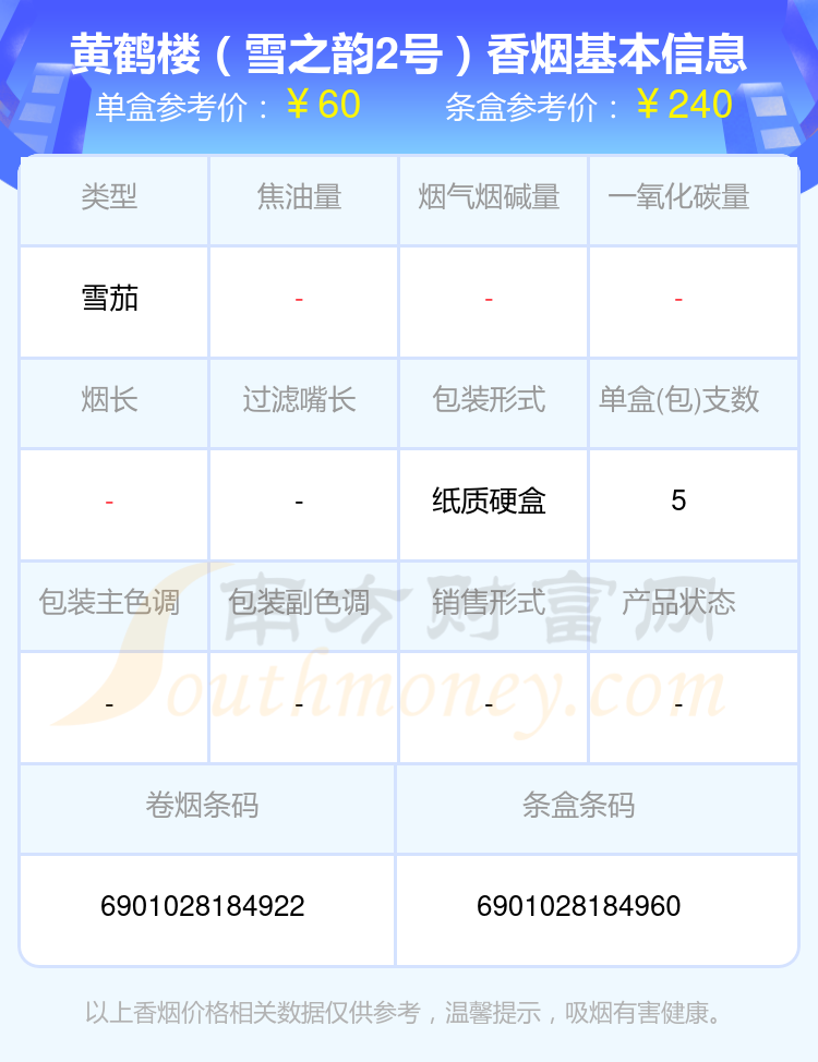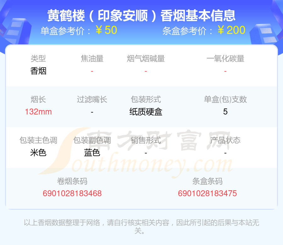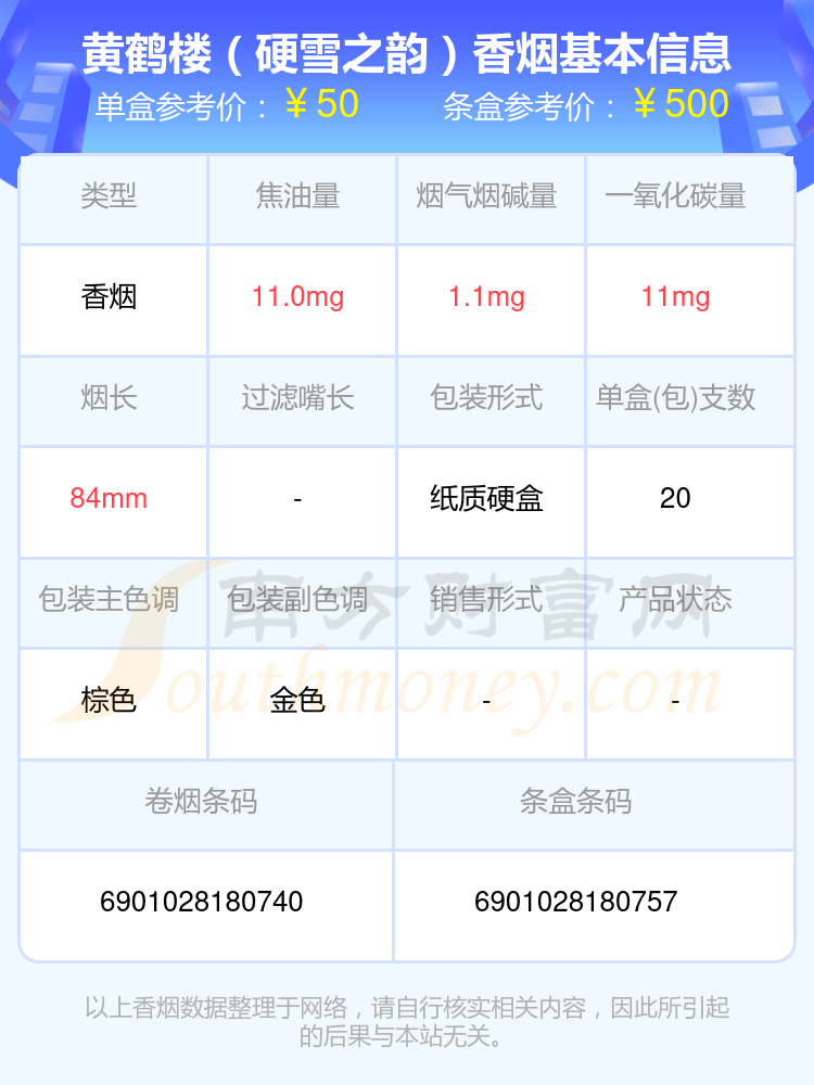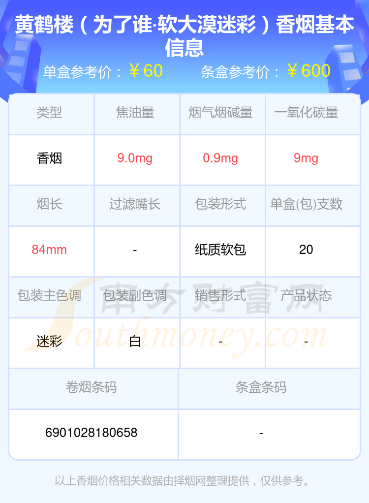 黃鶴樓香煙50元-60元左右的煙有黃鶴樓(為了誰·軟大漠迷彩)、黃鶴樓(軟正道)、黃鶴樓(雪之韻2號(hào))、黃鶴樓(蘭盾)、黃鶴樓(春秋淹城)、黃鶴樓(大德)、黃鶴樓(SX三峽)、黃鶴樓(硬雪之韻)、黃鶴樓(印象安順)、黃鶴樓(硬同心)等,詳細(xì)價(jià)格如下: