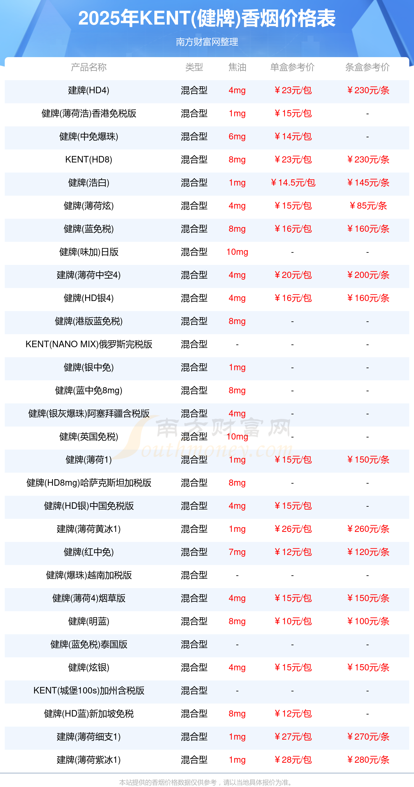 建牌(薄荷紫冰1)參考價28.0元/包、建牌(薄荷細支1)參考價27.0元/包、建牌(薄荷黃冰1)參考價26.0元/包、KENT(HD8)參考價23.0元/包、建牌(HD4)參考價23.0元/包。