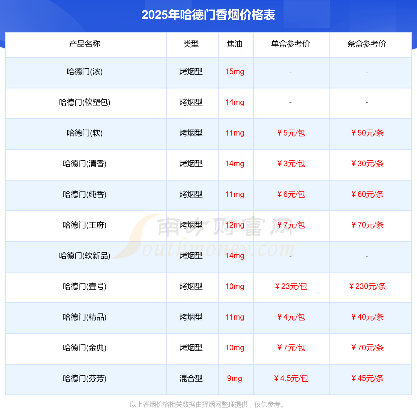 2025年哈德門香煙哈德門(壹號(hào))、哈德門(金典)、哈德門(王府)、哈德門(純香)、哈德門(軟)等最新價(jià)格如下:哈德門(壹號(hào))參考價(jià)23.0元/包、哈德門(金典)參考價(jià)7.0元/包、哈德門(王府)參考價(jià)7.0元/包、哈德門(純香)參考價(jià)6.0元/包、哈德門(軟)參考價(jià)5.0元/包。