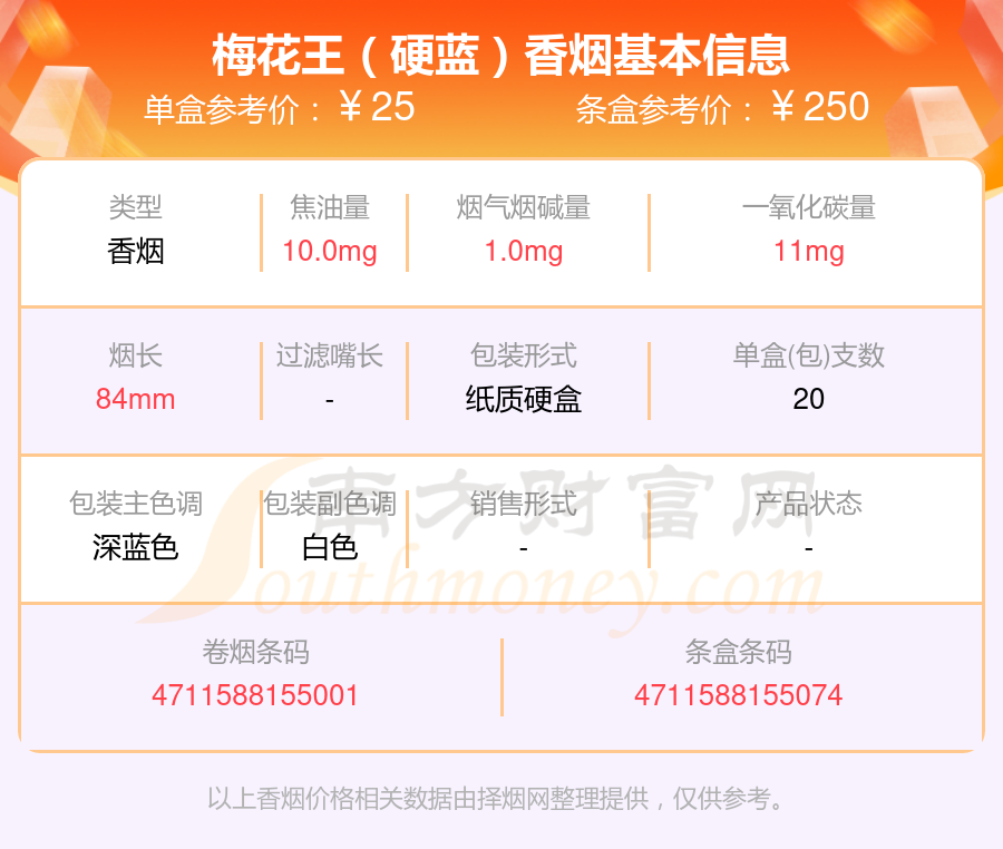 擇煙網(wǎng)為大家盤點了二十到四十元左右的梅花王香煙,分別有梅花王(旗袍紅硬包煙)、梅花王(硬紅)、梅花王(硬藍(lán))等,具體價格如下: