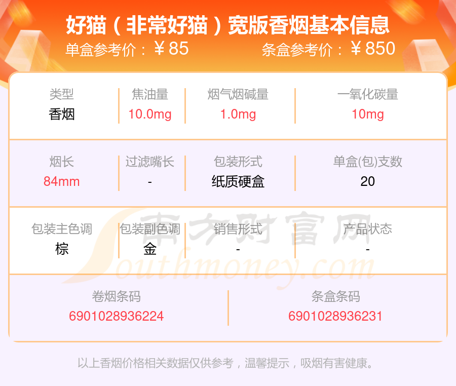 擇煙網(wǎng)為大家盤點(diǎn)了好貓香煙80元~100元的,分別有好貓(非常好貓)寬版、好貓(天賦)等,具體價(jià)格如下: