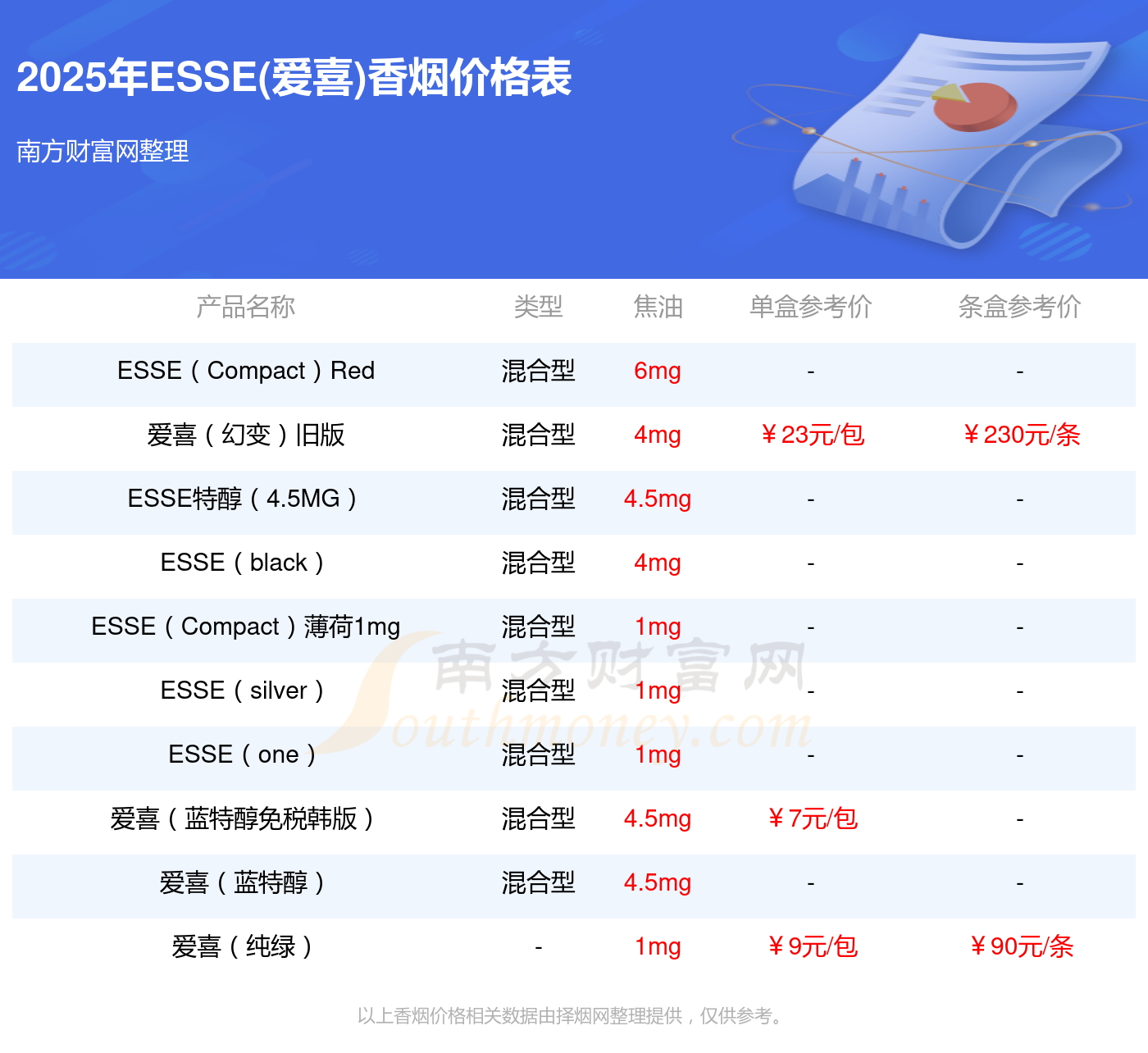 ESSE愛喜是韓國煙草公司旗下的品牌之一,目前中國大陸市場主要規(guī)格有ESSE薄荷(綠愛喜)、ESSE經(jīng)典(紅愛喜)、Esse特醇(藍愛喜)、Esse銀松(黑愛喜)等,是低刺激柔和的香煙。