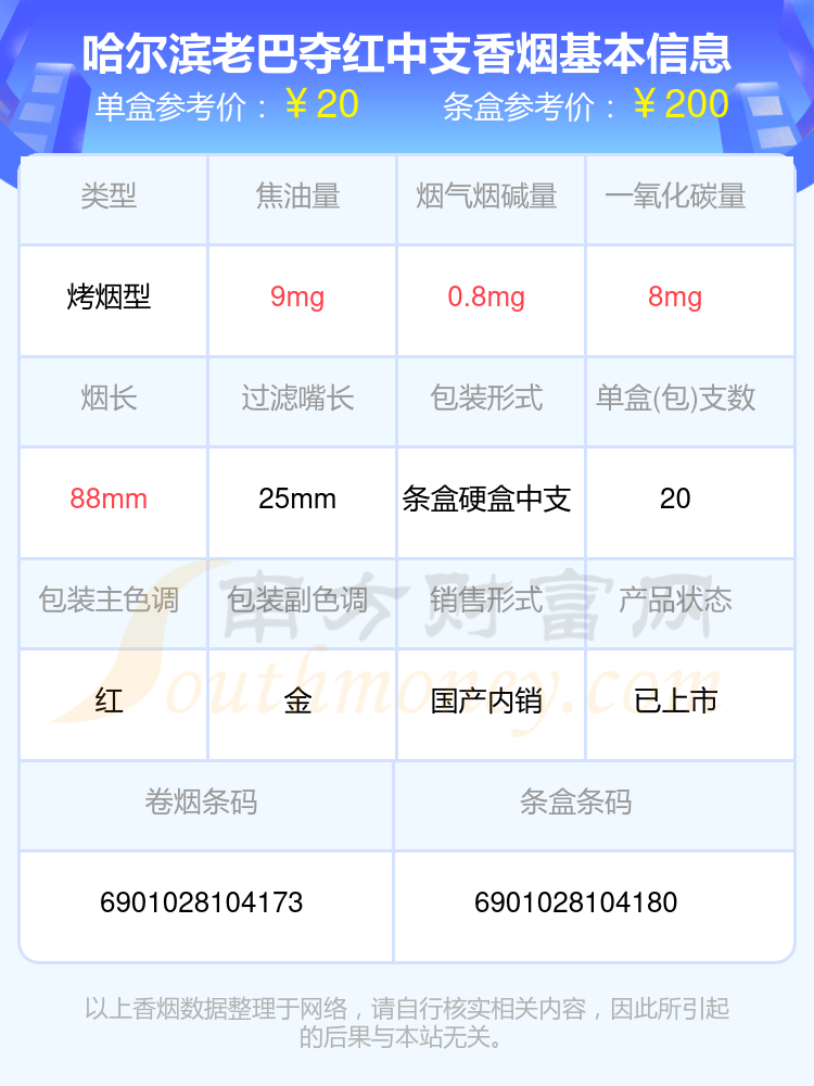 哈爾濱老巴奪紅中支單盒參考價:20元