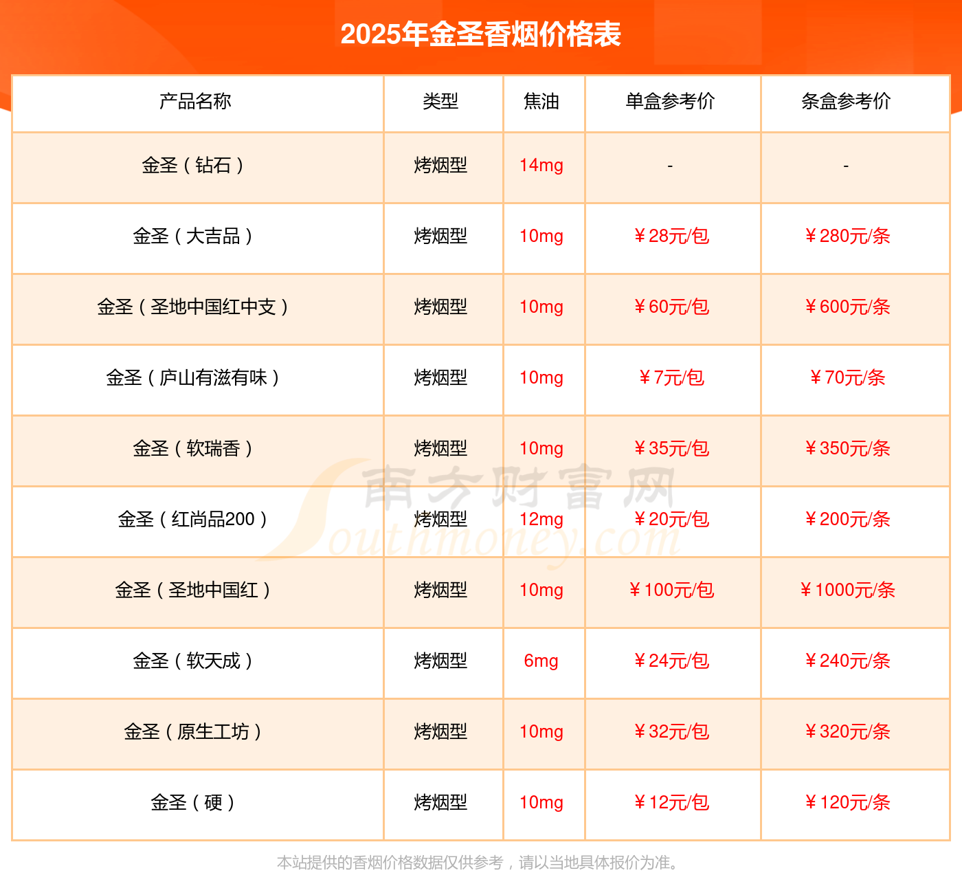 金圣卷煙創(chuàng)牌于1994年,為南昌卷煙廠的品牌,廣受關(guān)注的有軟盒金圣、硬盒金圣、軟盒東方金圣(金圣軟紅)、金圣吉品、金圣盛世典藏等產(chǎn)品,金圣獨創(chuàng)的草本提取“金圣香”,使金圣成為國內(nèi)外唯一榮獲國際發(fā)明金獎的卷煙產(chǎn)品和中式特色卷煙的品牌,收到國內(nèi)外的廣泛關(guān)注和贊譽。