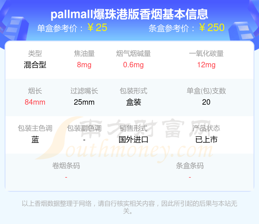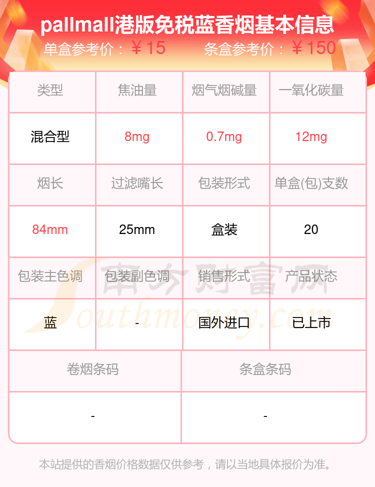 PALL MALL(長紅)香煙焦油量10mg以下的煙有pallmall爆珠港版、pallmall港版免稅藍(lán)等,具體價格如下: