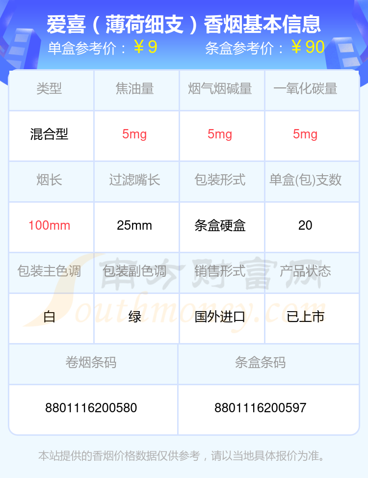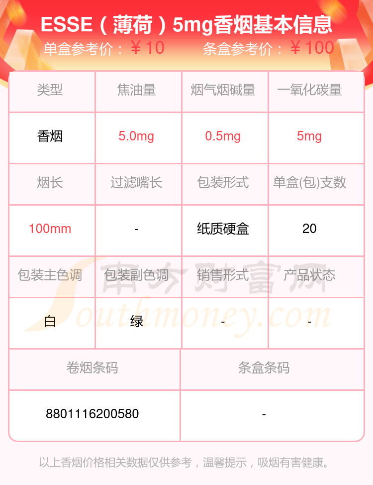 尼古丁低于5mg的ESSE(愛(ài)喜)香煙有哪些?擇煙網(wǎng)為大家整理盤點(diǎn),分別有:愛(ài)喜(薄荷細(xì)支)、愛(ài)喜(金)、ESSE(經(jīng)典)6mg、愛(ài)喜(經(jīng)典)、ESSE(Aura蘋果)中國(guó)免稅版、愛(ài)喜(藍(lán))、ESSE(edge)尼日利亞版、ESSE(薄荷)5mg、愛(ài)喜(薄荷)、愛(ài)喜(藍(lán)特醇免稅韓版)等,具體價(jià)格如下: