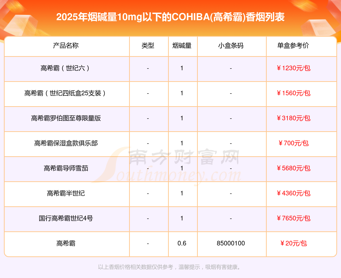 COHIBA(高希霸)香煙煙堿量10mg以下的煙有高希霸(世紀(jì)六)、高希霸(世紀(jì)四紙盒25支裝)、高希霸羅伯圖至尊限量版、高希霸保濕盒款俱樂部、高希霸導(dǎo)師雪茄、高希霸半世紀(jì)、國行高希霸世紀(jì)4號(hào)、高希霸等,具體價(jià)格如下: