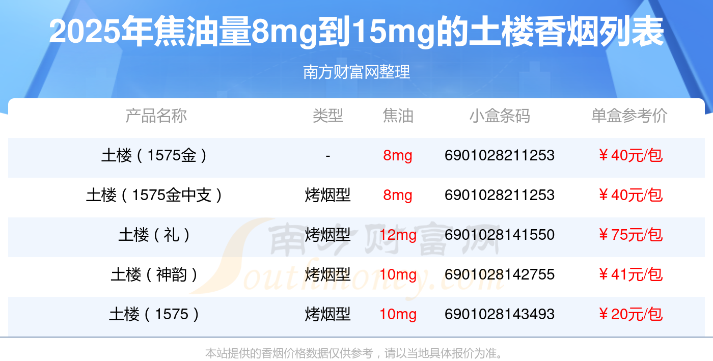 土樓(1575金)參考價(jià)40元/包、土樓(1575金中支)參考價(jià)40元/包、土樓(禮)參考價(jià)75.0元/包、土樓(神韻)參考價(jià)41.0元/包、土樓(1575)參考價(jià)20元/包等。