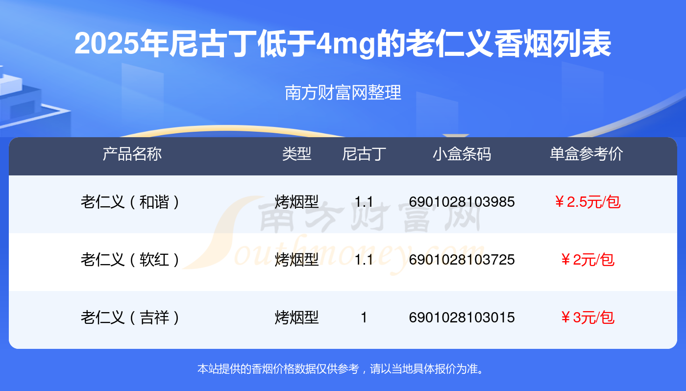擇煙網(wǎng)為大家盤點(diǎn)了老仁義香煙尼古丁低于4mg的,分別有老仁義(和諧)、老仁義(軟紅)、老仁義(吉祥)等,詳細(xì)價(jià)格如下: