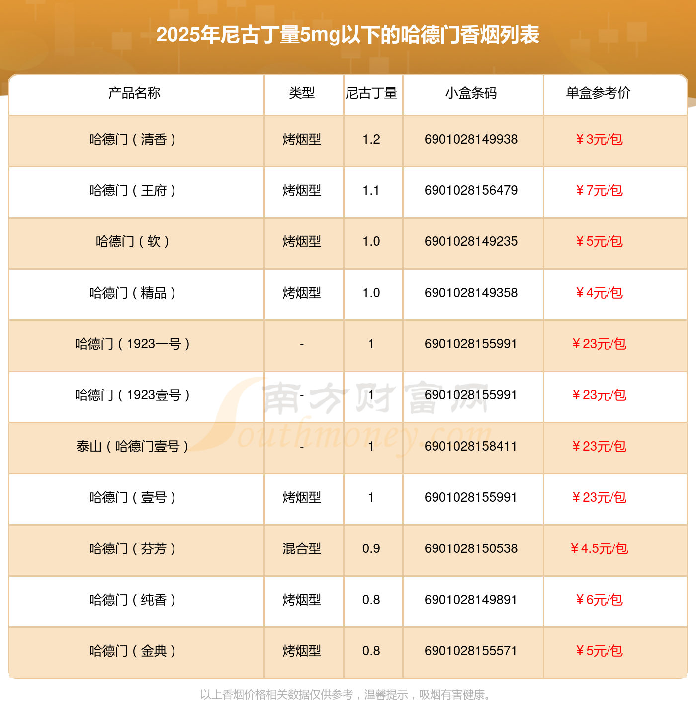 哈德門香煙尼古丁量5mg以下的煙有哪些?擇煙網(wǎng)為大家整理提供,分別有:哈德門(清香)、哈德門(王府)、哈德門(軟)、哈德門(精品)、哈德門(1923一號)、哈德門(1923壹號)、泰山(哈德門壹號)、哈德門(壹號)、哈德門(芬芳)、哈德門(純香)等,具體價(jià)格如下: