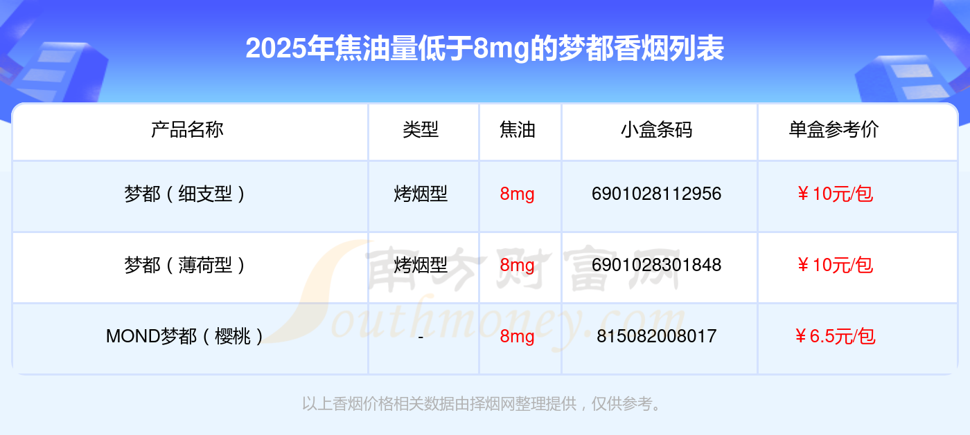 夢(mèng)都(細(xì)支型)參考價(jià)10.0元/包、夢(mèng)都(薄荷型)參考價(jià)10元/包、MOND夢(mèng)都(櫻桃)參考價(jià)6.5元/包等。