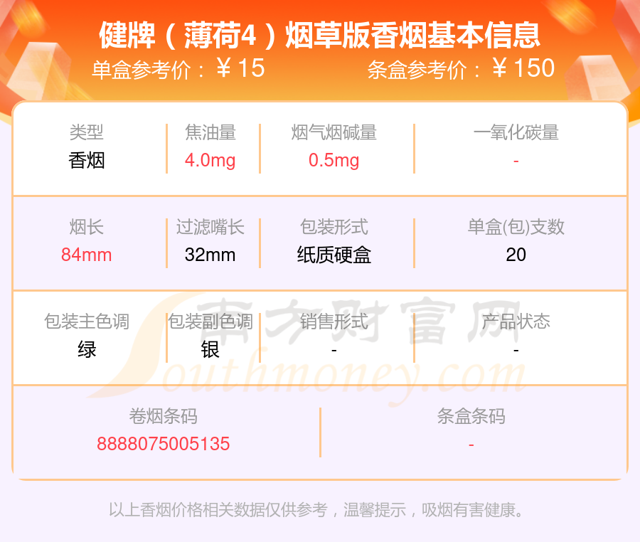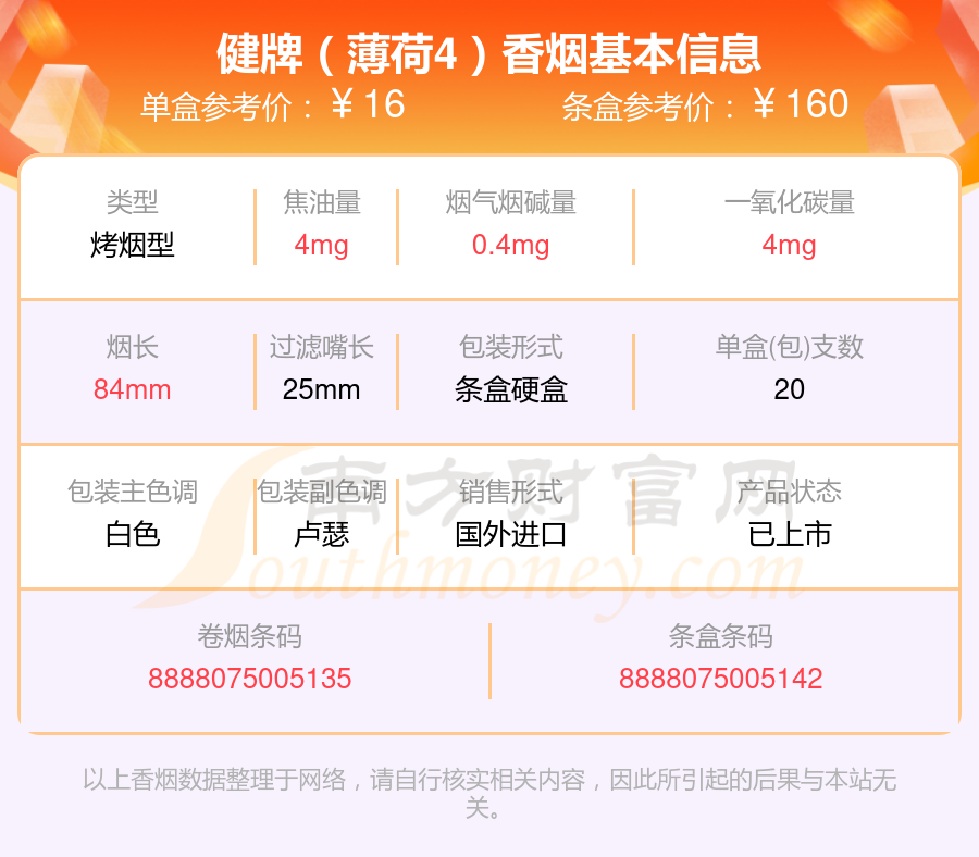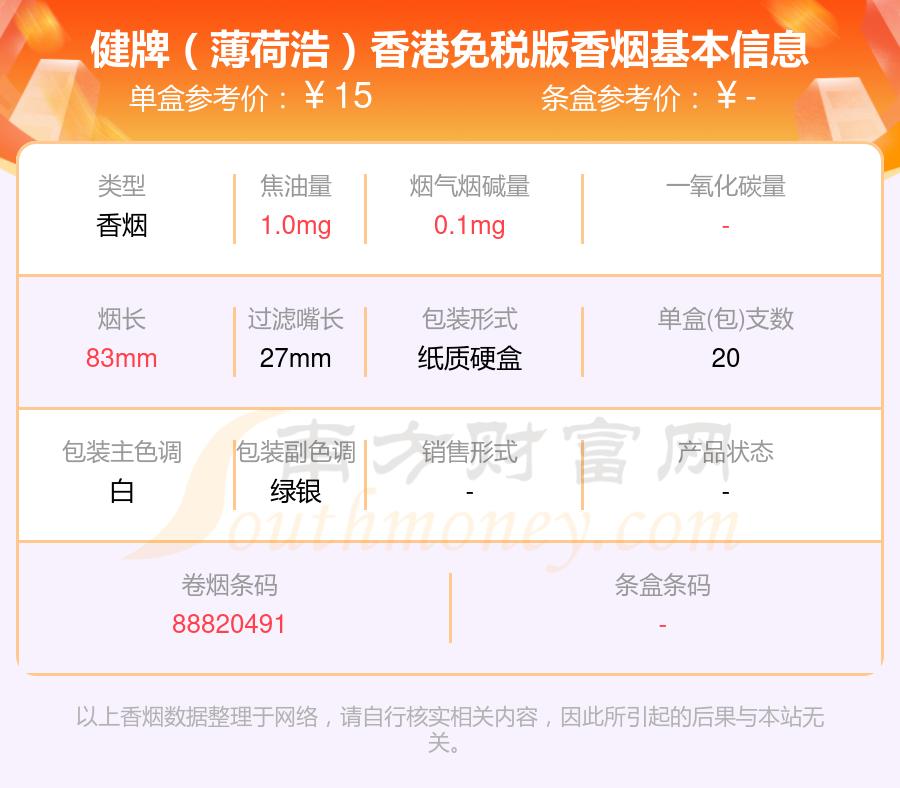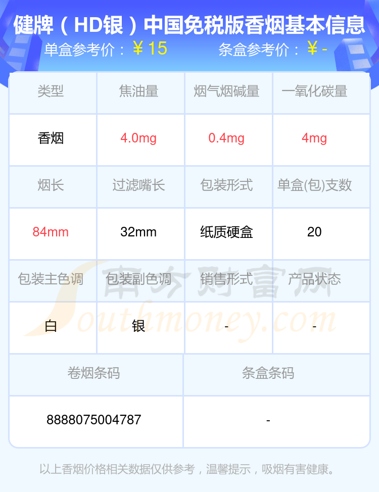 健牌(薄荷4)煙草版參考價(jià)15.0元/包、建牌(HD4)參考價(jià)23.0元/包、健牌(薄荷炫)參考價(jià)15.0元/包、健牌(HD銀)中國(guó)免稅版參考價(jià)15.0元/包、健牌(HD銀4)參考價(jià)16元/包、健牌(炫銀)參考價(jià)15元/包、健牌(薄荷4)參考價(jià)16元/包、建牌(薄荷中空4)參考價(jià)18元/包、健牌(薄荷浩)香港免稅版參考價(jià)15.0元/包、建牌(薄荷黃冰1)參考價(jià)26.0元/包等。