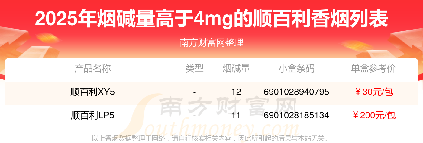 順百利香煙煙堿量高于4mg的煙分別有順百利XY5參考價30元/包、順百利LP5參考價200元/包等。