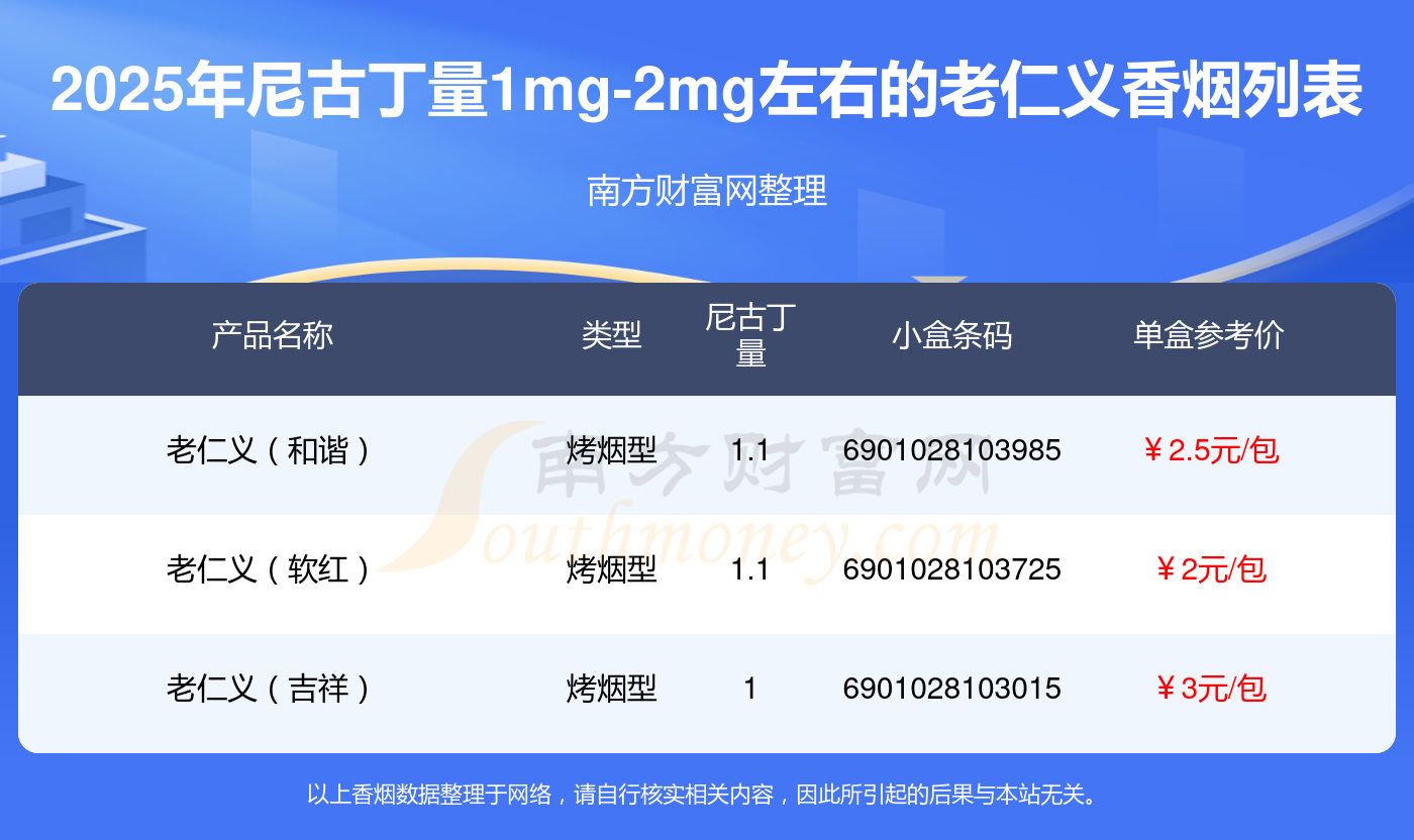 尼古丁量1mg-2mg左右的老仁義香煙有哪些?擇煙網(wǎng)為大家整理盤點,分別有: