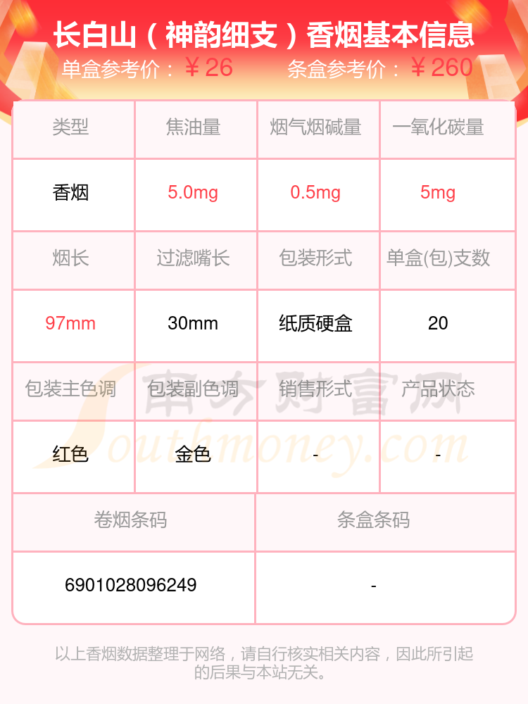 擇煙網(wǎng)為大家盤點(diǎn)了尼古丁低于0.5mg的長白山香煙,分別有長白山(神韻細(xì)支)、長白山(德容天下)、長白山(高山流水)等,具體價(jià)格如下: