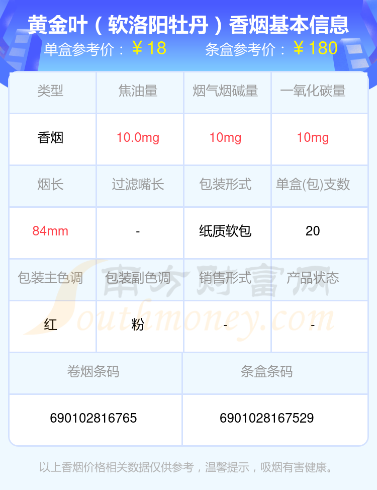 黃金葉香煙煙堿超過(guò)4mg的煙分別有黃金葉(軟洛陽(yáng)牡丹)參考價(jià)18.0元/包、黃金葉(百年濃香)典藏參考價(jià)42.0元/包等。