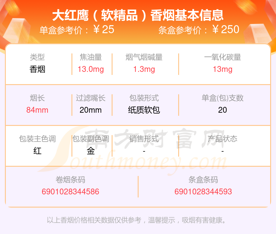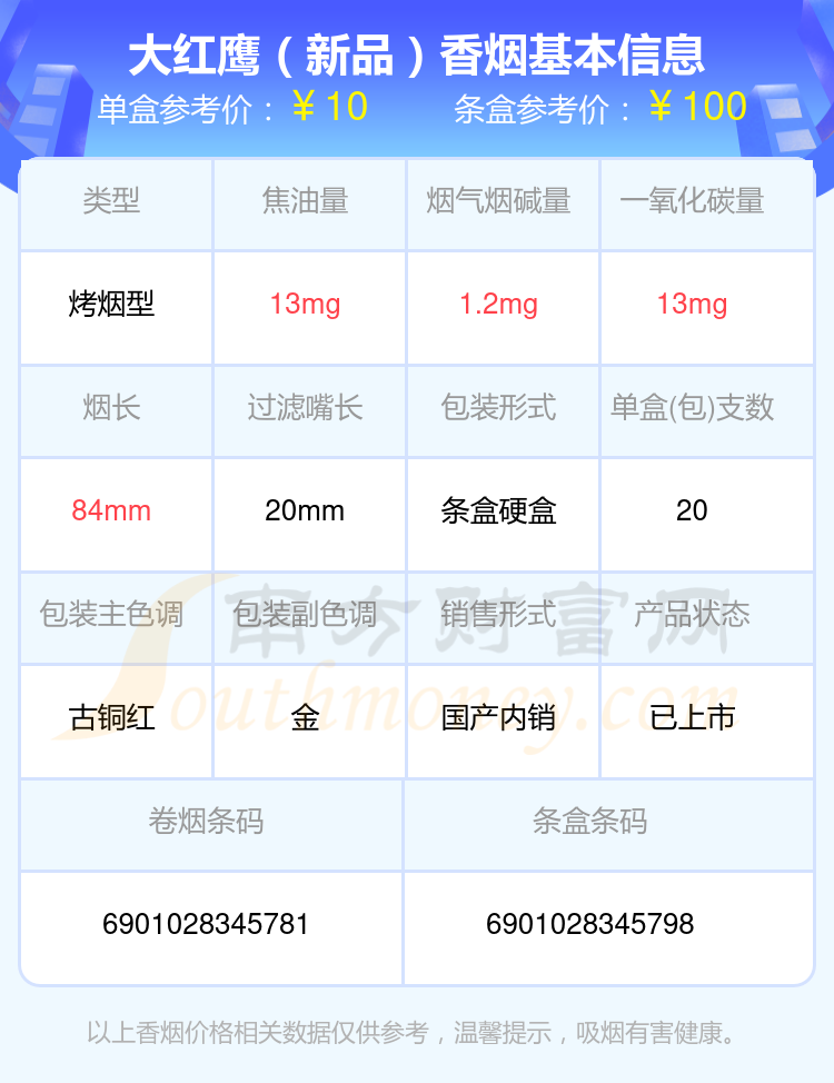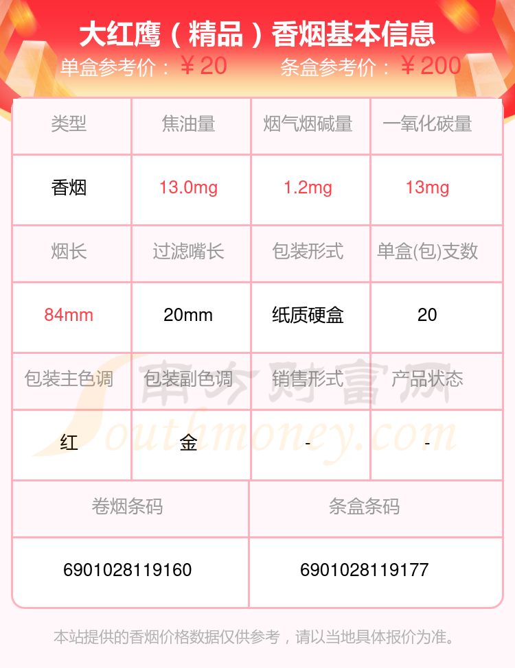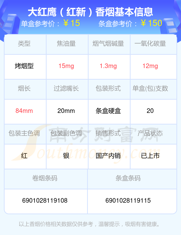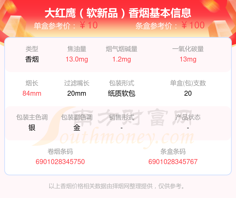 尼古丁4mg以下的大紅鷹香煙有哪些?擇煙網(wǎng)為大家整理盤點(diǎn),有大紅鷹(英文)、大紅鷹(軟)、大紅鷹(紅新)、大紅鷹(紅)、大紅鷹(軟精品)、大紅鷹(福星紅)、大紅鷹(新品)、大紅鷹(銀)、大紅鷹(精品)、大紅鷹(軟新品)等,詳細(xì)價(jià)格如下: