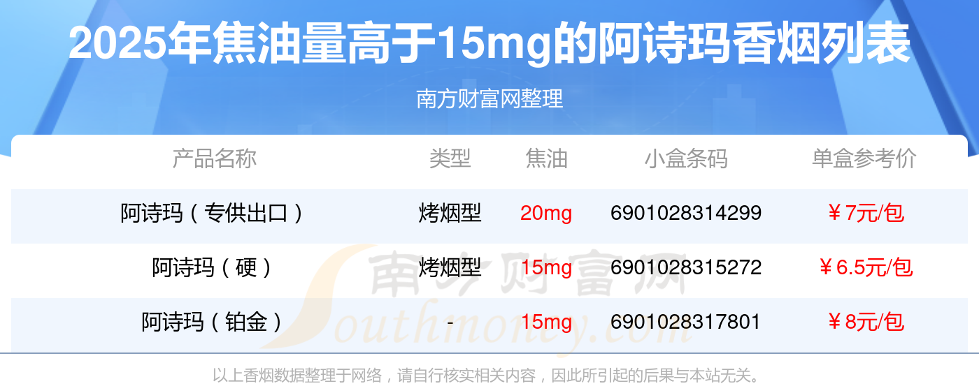 擇煙網(wǎng)為大家盤(pán)點(diǎn)了焦油量高于15mg的阿詩(shī)瑪香煙,有阿詩(shī)瑪(專(zhuān)供出口)、阿詩(shī)瑪(硬)、阿詩(shī)瑪(鉑金)等,詳細(xì)價(jià)格如下: