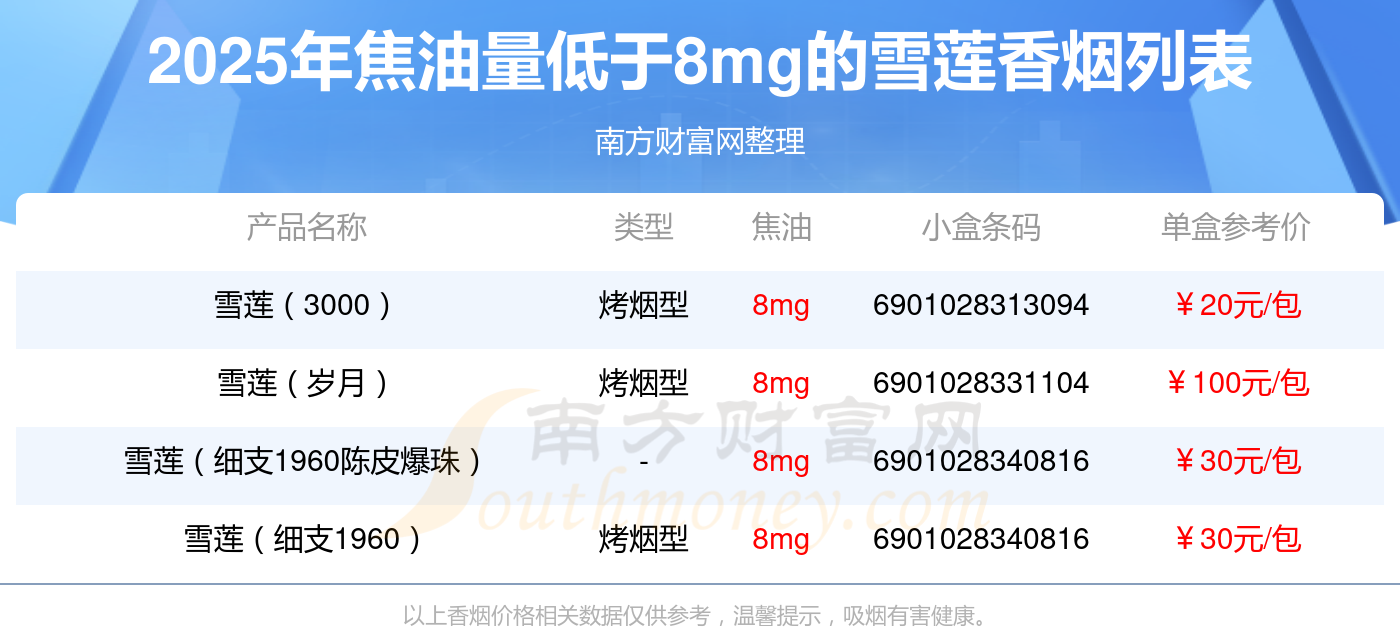 焦油量低于8mg的雪蓮香煙有哪些?擇煙網為大家整理盤點,分別有: