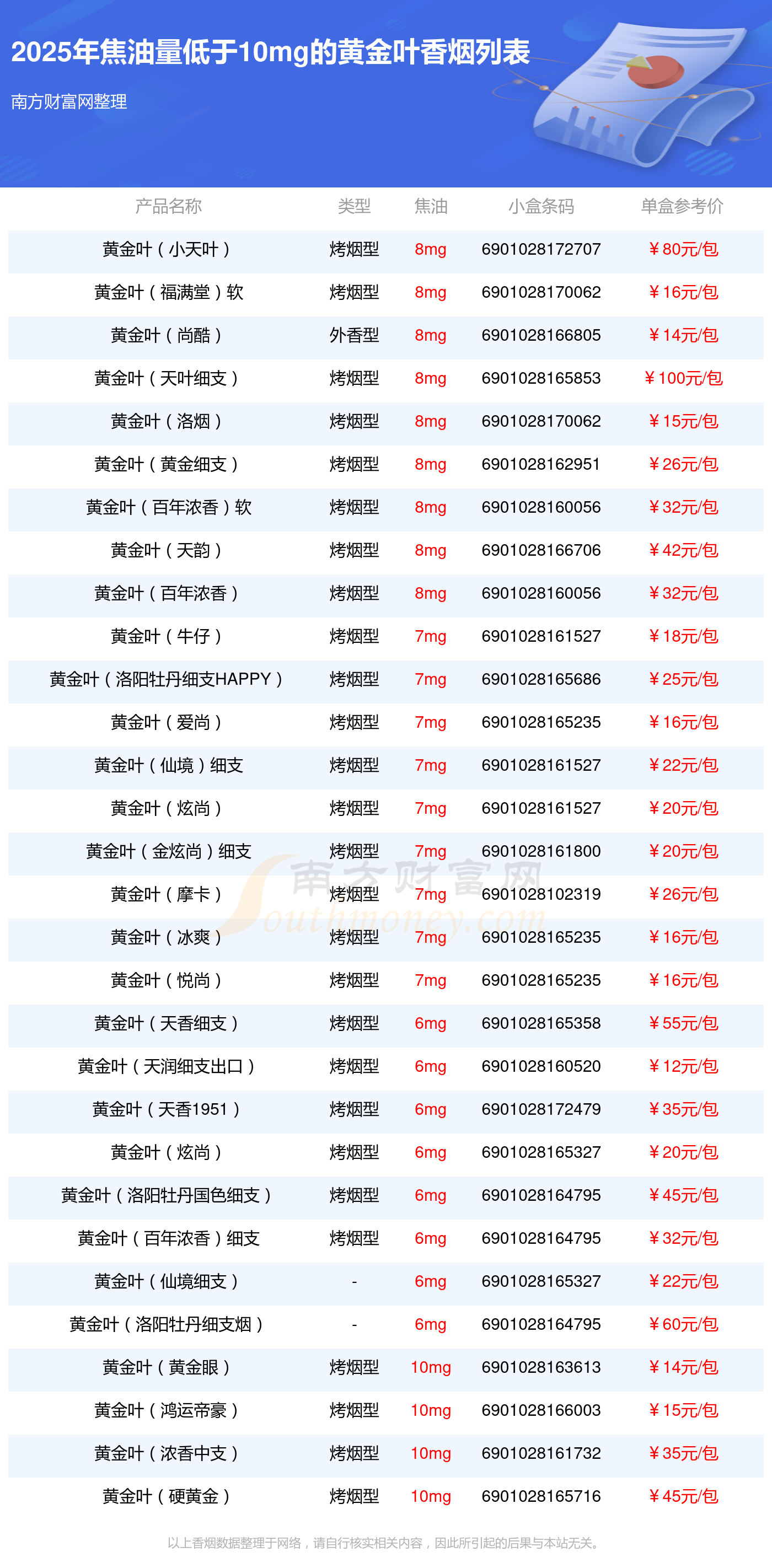 黃金葉香煙焦油量低于10mg的有哪些?擇煙網(wǎng)為大家整理提供,分別有: