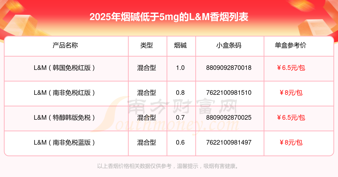 擇煙網(wǎng)為大家盤點(diǎn)了L&M香煙煙堿低于5mg的,分別有L&M(韓國免稅紅版)、L&M(南非免稅紅版)、L&M(特醇韓版免稅)、L&M(南非免稅藍(lán)版)等,詳細(xì)價格如下: