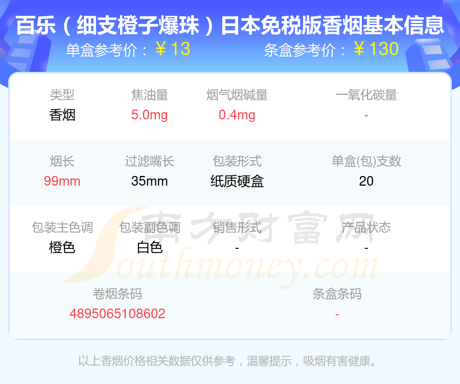 PEEL(百樂)香煙煙堿量低于5mg的煙有百樂(紅酒爆珠)、百樂(細支橙子爆珠)日本免稅版等,詳細價格如下: