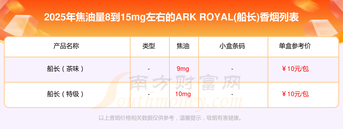 擇煙網(wǎng)為大家盤點了ARK ROYAL(船長)香煙焦油量8到15mg左右的,分別有船長(茶味)、船長(特級)等,具體價格如下: