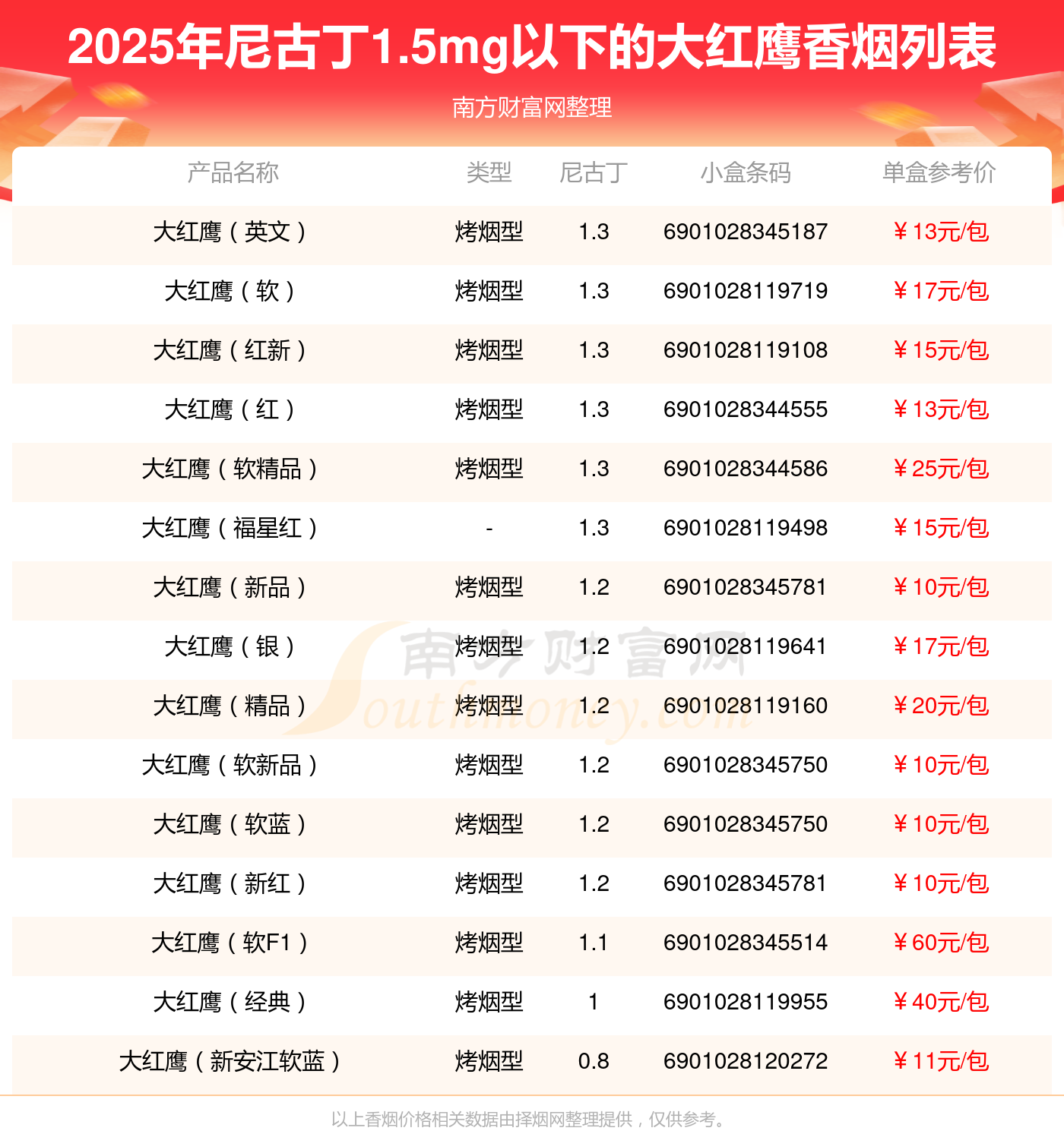 大紅鷹香煙尼古丁1.5mg以下的有哪些?擇煙網(wǎng)為大家整理提供,分別有: