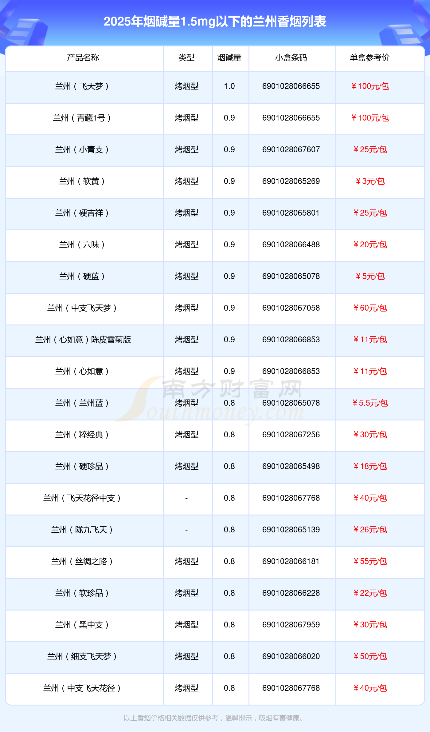 蘭州(飛天夢)參考價100.0元/包、蘭州(青藏1號)參考價100元/包、蘭州(小青支)參考價25元/包、蘭州(軟黃)參考價3.0元/包、蘭州(硬吉祥)參考價25.0元/包、蘭州(六味)參考價20.0元/包、蘭州(硬藍)參考價5.0元/包、蘭州(中支飛天夢)參考價60.0元/包、蘭州(心如意)陳皮雪菊版參考價11.0元/包、蘭州(心如意)參考價11.0元/包等。
