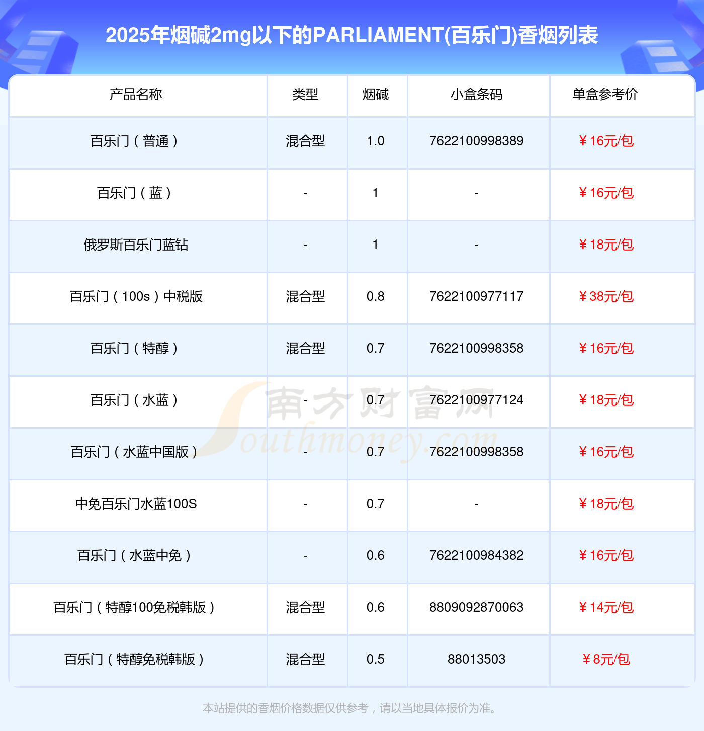 PARLIAMENT(百樂門)香煙煙堿2mg以下的有哪些?擇煙網(wǎng)為大家整理提供,分別有: