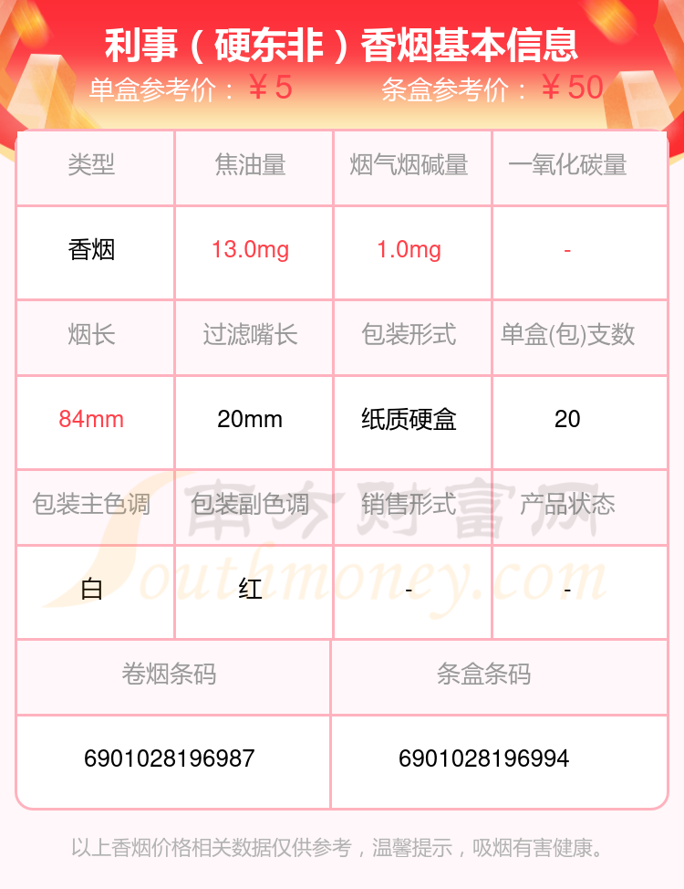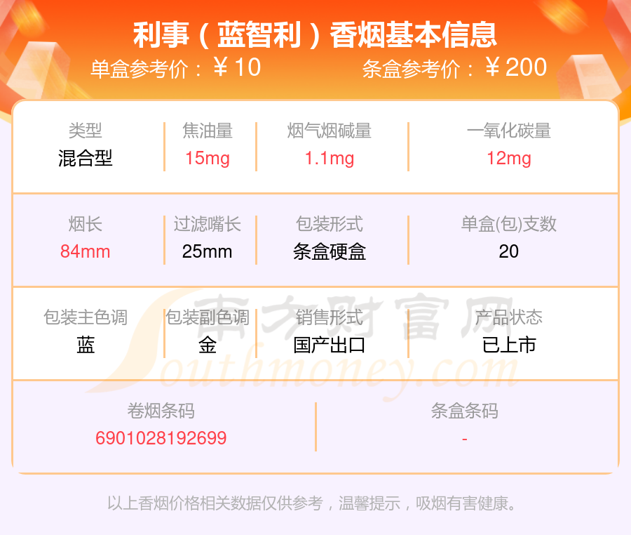 利事香煙尼古丁量1~2mg的煙有利事(藍(lán)智利)、利事(藍(lán)馬)、利事(硬東非)等,具體價格如下: