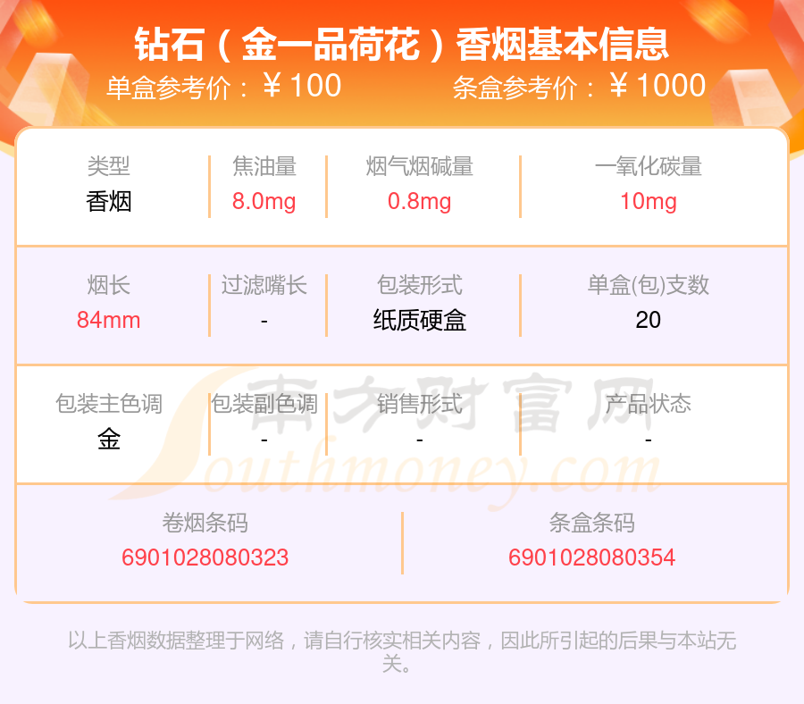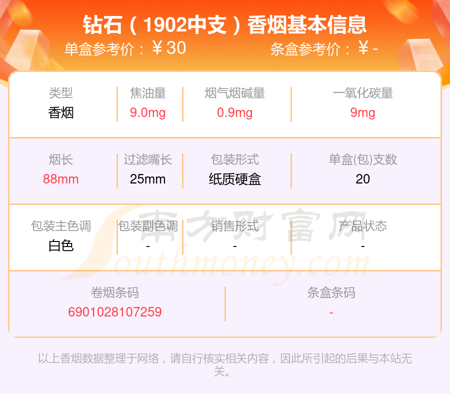 擇煙網為大家盤點了焦油量8mg至15mg左右的鉆石香煙,分別有鉆石(1902中支)、鉆石(荷花經典中支)、鉆石(冬韻中支)、鉆石(金一品荷花)、鉆石(風尚心世界)、鉆石(時尚粗支)、鉆石(金石)、鉆石(藍時尚細支)、鉆石(一品荷花)、鉆石(硬紅120)等,具體價格如下: