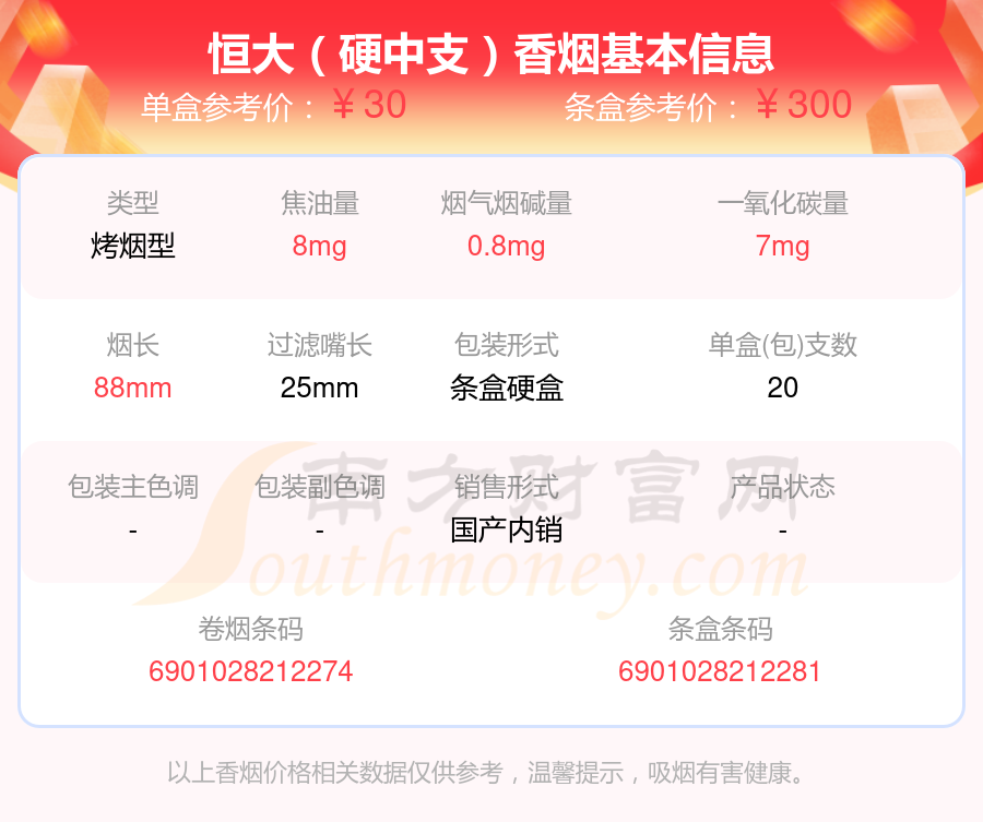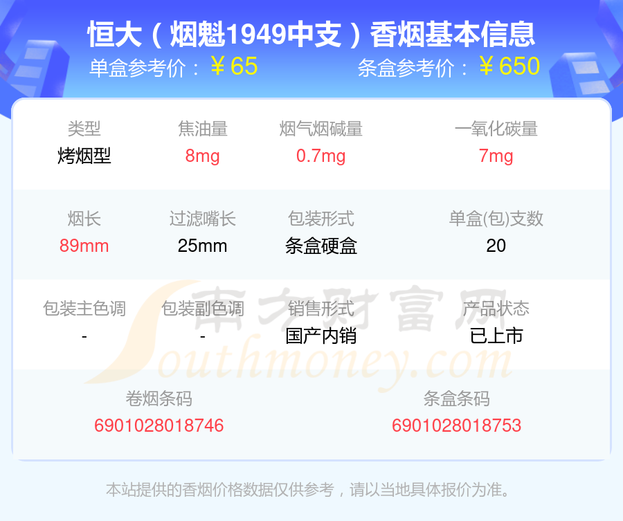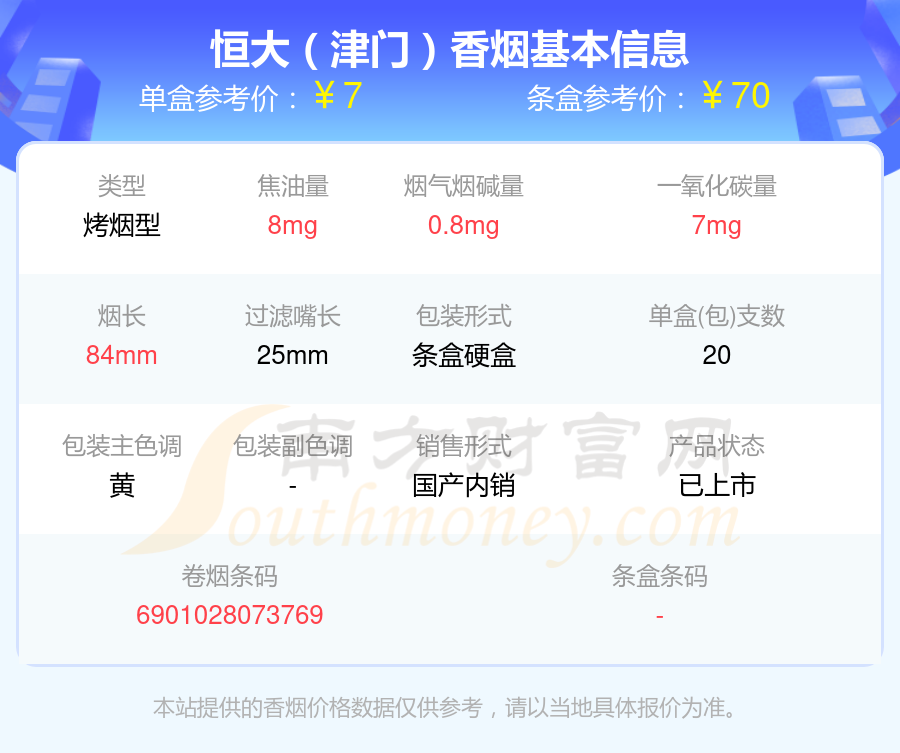 擇煙網為大家盤點了恒大香煙焦油量低于10mg的,分別有恒大(津門)、恒大(煙魁1949)、恒大(記憶1949中支)、恒大(硬中支)、恒大(煙魁1949中支)、恒大(煙魁1919)、恒大(全開式煙魁)、恒大(記憶1949)等,詳細價格如下: