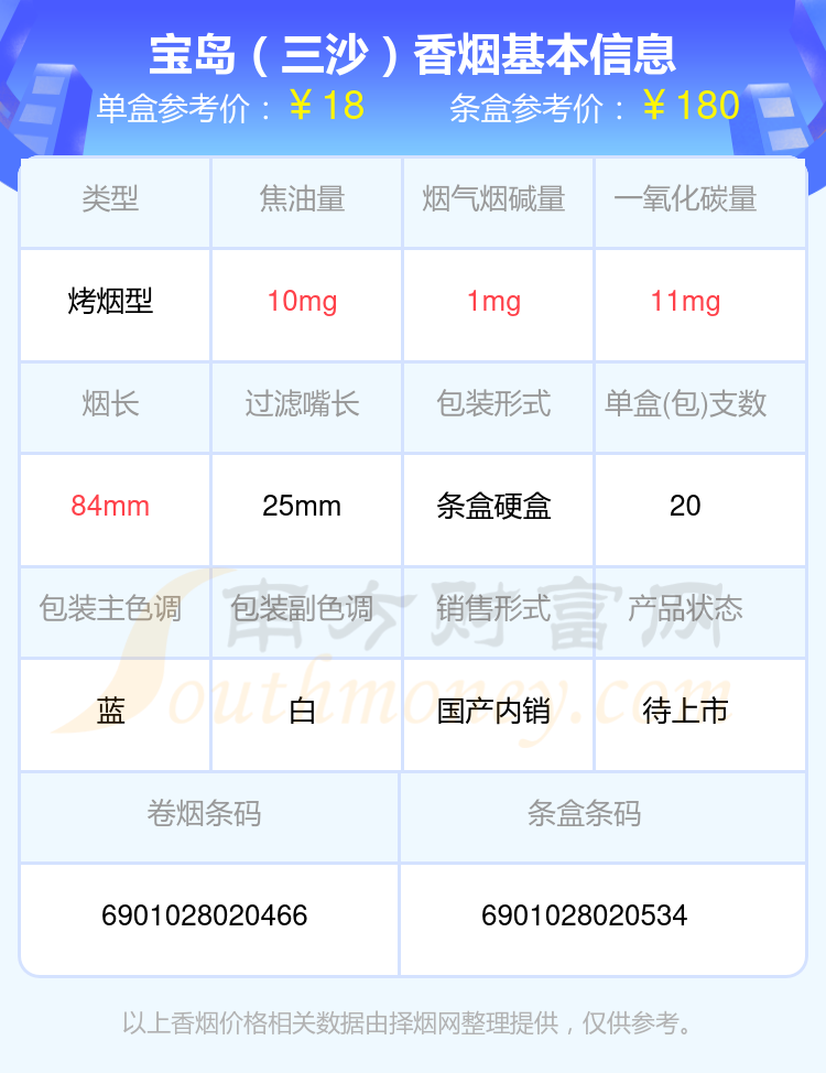 尼古丁低于1mg的寶島香煙有哪些?擇煙網(wǎng)為大家整理盤點(diǎn),有寶島(三沙)、寶島、寶島(一品沉香)、寶島(金)、寶島(中支)、寶島(三沙細(xì)支)、寶島(天葉國(guó)際包日月潭)、寶島(醇葉)等,詳細(xì)價(jià)格如下: